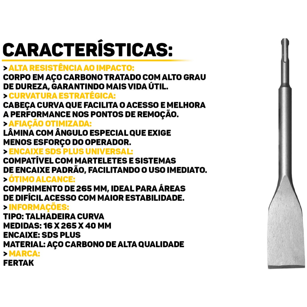 Talhadeira Curva Sds Plus 16 X 265 - 40 Fertak A Talhadeira Curva SDS Plus Fertak foi desenvolvida para garantir máxima eficiência na remoção de alvenarias leves, revestimentos e pisos, especialmente em trabalhos com marteletes roto-perfuradores. Com afiação especial em ângulo, oferece maior poder de impacto e precisão no corte, facilitando o trabalho em obras e reformas. Fabricada em aço carbono de alta resistência, possui excelente durabilidade, além de acabamento reforçado. Seu encaixe SDS-Plus garante total compatibilidade com os principais modelos de marteletes disponíveis no mercado. Características: > Afiação com ângulo especial para alto desempenho no impacto; > Ideal para remoção de pisos, azulejos e alvenarias leves; > Compatível com marteletes roto-perfuradores com encaixe SDS Plus; > Alta resistência e durabilidade; > Uso profissional e doméstico. Especificações: > Material: Aço carbono; > Comprimento: 265 mm; > Largura da ponta: 40 mm; > Encaixe SDS Plus; > Indicação de uso: Remoção de alvenarias, pisos, revestimentos. - Marca: Fertak - Garantia: 90 dias contra defeitos de fabricação Vantagens de comprar na Brester: - Produto a pronta entrega. - Produto novo, com garantia de fábrica. - Nota fiscal para Pessoa Física e Pessoa Jurídica.