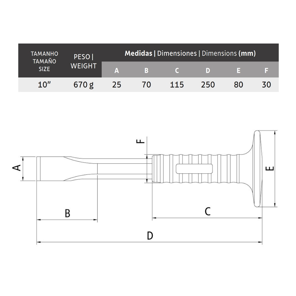 Talhadeira Sextavada 10" Tramontina PRO com Empunhadura 44473/926 Descrição do Produto: - Talhadeira produzida em aço cromo vanádio; - Têmpera por indução no gume de corte; - Empunhadura injetada em PVC; - A empunhadura protege as mãos do usuário durante o uso, além de proporcionar melhor agarre e conforto; - Acabamento fosfatizado; - A camada de fosfato mais a deposição de óleo aplicado na superfície das peças garantem uma proteção excelente contra a corrosão; - Remover rebarbas e cortar arames e chapas finas, pode também abrir sulcos em chapas metálicas planas, em locais de difícil acesso. Dados Técnicos: - Marca: Tramontina PRO; - Referência: 44473/926; - Dimensões do produto: 290x90x90 mm; - Peso: 0,69 Kg. Itens Inclusos: - 01 Talhadeira com Empunhadura 10" Tramontina PRO 44473/926.