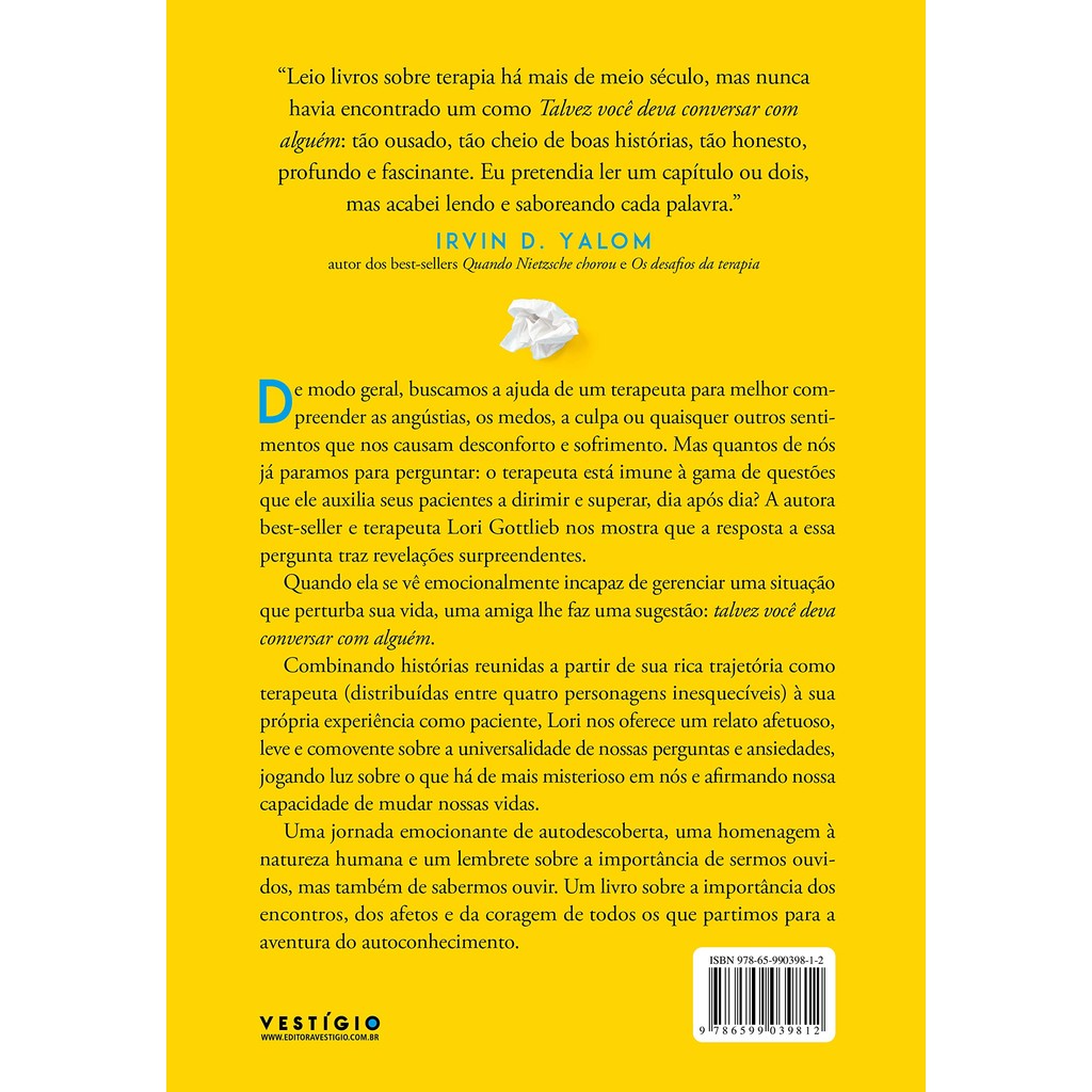 De modo geral, buscamos a ajuda de um terapeuta para melhor compreender as angústias, os medos, a culpa ou quaisquer outros sentimentos que nos causam desconforto e sofrimento. Mas quantos de nós já paramos para perguntar: o terapeuta está imune à gama de questões que ele auxilia seus pacientes a dirimir e superar, dia após dia? A autora best-seller e terapeuta Lori Gottlieb nos mostra que a resposta a essa pergunta traz revelações surpreendentes.Quando ela se vê emocionalmente incapaz de gerenciar uma situação que perturba sua vida, uma amiga lhe faz uma sugestão: talvez você deva conversar com alguém.Combinando histórias reunidas a partir de sua rica trajetória como terapeuta (distribuídas entre quatro personagens inesquecíveis) à sua própria experiência como paciente, Lori nos oferece um relato afetuoso, leve e comovente sobre a universalidade de nossas perguntas e ansiedades, e joga luz sobre o que há de mais misterioso em nós, afirmando nossa capacidade de mudar nossas vidas.Uma jornada emocionante de autodescoberta, uma homenagem à natureza humana e um lembrete sobre a importância de sermos ouvidos, mas também de sabermos ouvir. Um livro sobre a importância dos encontros, dos afetos e da coragem de todos os que partimos para a aventura do autoconhecimento.