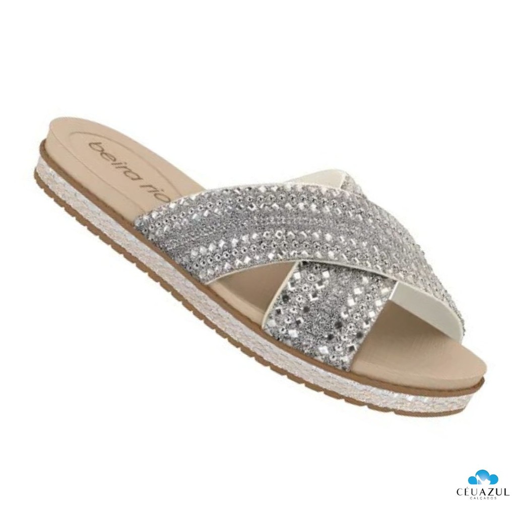 Tamanco Rasteira Beira Rio Feminino Strass Brilho em X Confortável