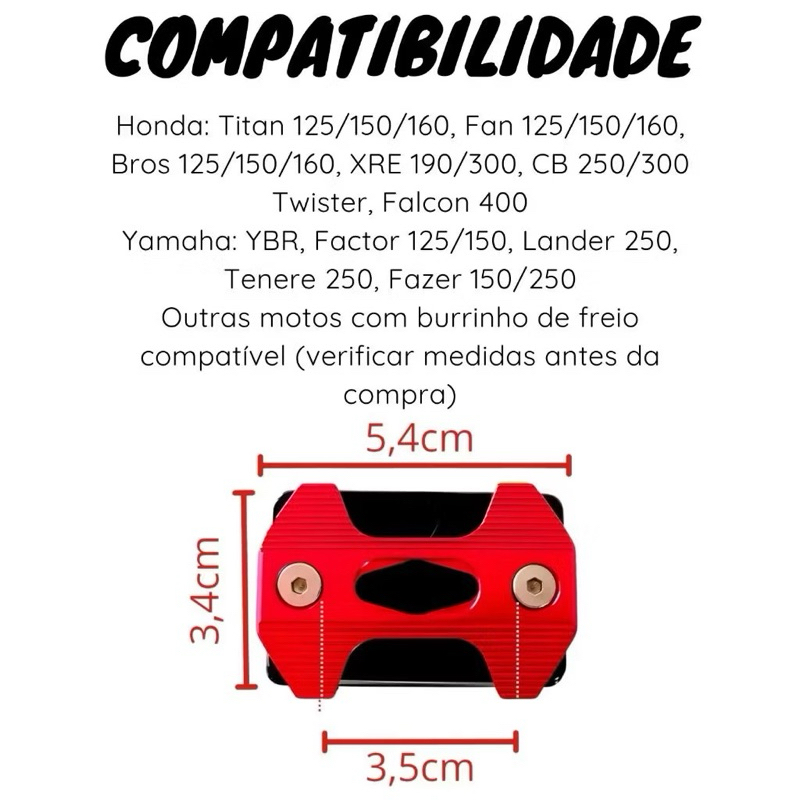 🚀 Tampa de Cilindro Mestre para Motos – compatível com modelos Honda e Yamaha: Fan, Titan, Factor, XRE, CB, Twister, Bros. ✅ Produzida em alumínio anodizado de alta resistência ✅ Acabamento premium com cores vivas e resistentes ao desgaste ✅ Fácil instalação – substitui a tampa original sem adaptações ✅ Protege e personaliza sua moto, dando um visual mais esportivo 📏 Especificações: • Material: Alumínio anodizado • Cores disponíveis: Azul, Dourado, Vermelho, Prata • Fixação por parafusos (inclusos) 💡 Ideal para quem quer estilo e durabilidade no sistema de freio da moto.