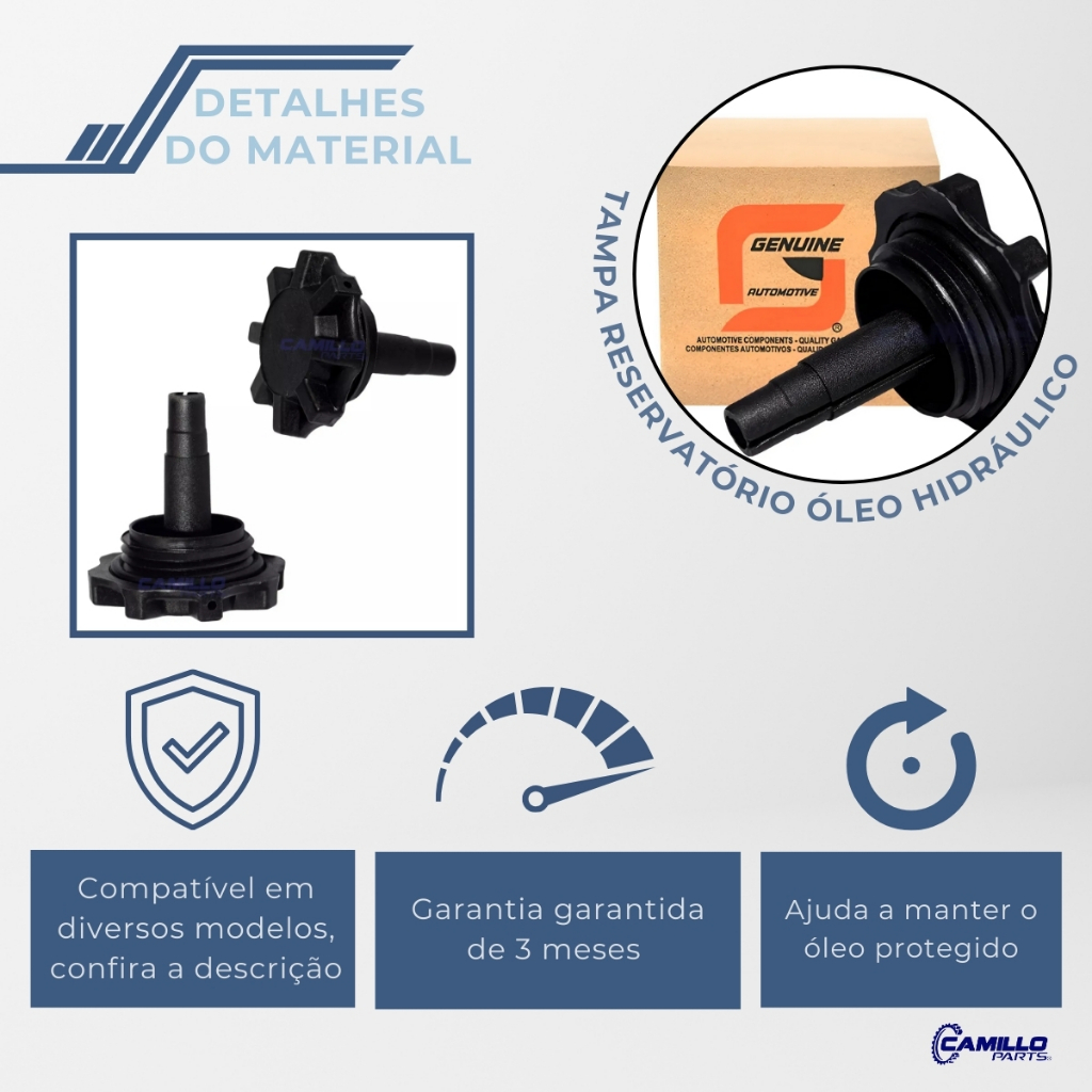 Bem vindo!! Você está em uma loja especializada em soluções automotivas seguras e confiáveis. Aqui, cada detalhe é pensado para cuidar do que move você: sua família, sua segurança e seus melhores momentos na estrada. PRODUTO NOVO Precisa de uma tampa de reservatório de óleo hidráulico confiável para seu Chevrolet? Características do Produto – Marca: Genuine Automotive – Condição: novo – Tipo: tampa para reservatório de óleo da direção hidráulica – Garantia de fábrica – Códigos compatíveis: 30531 / 40035 / A0004601714 / 90511772 / TC-2041 Por que escolher este produto – Fabricado com materiais resistentes e de alta durabilidade – Compatibilidade perfeita com diversos modelos Chevrolet e Mercedes-Benz – Mantém o sistema hidráulico protegido contra vazamentos e impurezas – Produto original e confiável para reposição de qualidade Dicas de Uso – Certifique-se de que a aplicação corresponde ao modelo e ano do veículo – Mantenha o reservatório sempre bem fechado para evitar contaminações – Recomenda-se instalação por profissional especializado Perguntas Frequentes – Essa tampa serve no Chevrolet Agile 2013? Sim, compatível com todos os anos de 2010 a 2018. – Essa tampa também é compatível com Mercedes Sprinter? Sim, compatível com Sprinter 310, 312 e 412 de 1997 a 2011. – O produto é novo ou recondicionado? Produto 100% novo, direto de fábrica. Produto ideal para manter o sistema de direção em perfeito funcionamento.