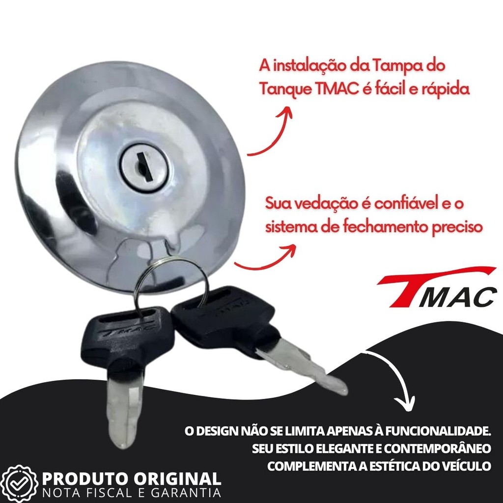 Kit tampa do tanque com 2 chaves, fabricado com material resistente, é a escolha ideal para quem busca qualidade e custo-benefício. Compatível com: - Yamaha YBR 125: 2005 em diante; - Yamaha YBR 125 Factor ED: 2008 até 2015; - Yamaha XTZ 125: 2006 em diante; - Yamaha Factor 150: todos os anos; - Yamaha Fazer 150 ED/SED: 2014 em diante; - Yamaha Fazer 250: 2006 até 2017; - Yamaha Lander 250: 2007 até 2018. Detalhes: - Fabricada com materiais de alta qualidade, a tampa de tanque oferece durabilidade e resistência, assegurando proteção confiável contra vazamentos; - Além da funcionalidade, seu design elegante complementa a estética do veículo, adicionando sofisticação com linhas limpas e acabamentos impecáveis; - Fácil e rápida de instalar, a tampa do tanque TMAC se adapta perfeitamente a qualquer modelo de veículo, proporcionando uma experiência suave e livre de complicações; - Acompanha 2 chaves. Especificações: - Até 3 meses de garantia contra defeitos de fábrica. Itens Inclusos: - 01 tampa do tanque; - 02 chaves.