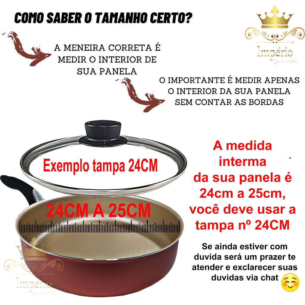 Prazer, somos a “Imperio Variedades”. Confira nossa loja, temos outros modelos, tamanhos e promoções Quer um toque especial para sua casa? Então você não pode deixar de conhecer, nossa variedade de produtos, criativos, de alta qualidade e originalidade. Beleza, elegância e charme na hora de cozinhar, você vai se apaixonar por essa linda Tampa de Vidro, compatível com panela, caçarola e frigideira. Dê um toque de sofisticação na sua cozinha! Tenha a tranquilidade de comprar com quem está disposto a te oferecer, o melhor suporte e atendimento, sua confiança e satisfação valem ouro para nós. Nossa equipe de pós venda está à disposição para te auxiliar e esclarecer eventuais dúvidas. Especificações do Produto Tampa de vidro temperado 26 cm, borda de aço inox e saída de vapor, com design moderno incrivelmente elegante e que vai facilitar no preparo do alimento, por ser transparente, permite visualizar os alimentos durante o cozimento. Produzido com material de qualidade, peça com maior resistência, durabilidade e fácil de limpar. Ainda, possui puxador feito em baquelite, um material antitérmico, que não retém calor, contribuindo para um manuseio mais confortável e seguro. Essa tampa de vidro extremamente elegante e sofisticada, vai trazer a beleza e o conforto e a praticidade que sua cozinha merece. Especificações Técnicas: Dimensões aproximadas cm: 26 x 4 Altura do encaixe da panela: 0,5 cm Compatível com: Panela numeração 26 Forma da bandeja de dentro (encaixa dentro da panela): 25,5 cm de largura Tampa: Vidro Transparente Material Tampa: Vidro Temperado Material Puxador: Baquelite Cor Puxador: Preto Peso: 600 g Embalagem: Saco Plástico / Caixa Parda Dimensões aproximadas da embalagem (AxLxP): 30 x 30 x 8 cm Peso Embalagem: 200 g Garantia do fornecedor: 30 dias contra defeitos de fabricação. Cuidados: - Antes de usar pela primeira vez, lave com esponja macia, detergente neutro. - Nunca use utensílios de metal ou objetos pontiagudos; - Não exponha diretamente ao fogo ou fonte de calor prolongado; - Não pode ser levada ao forno e/ou microondas; - Evite a imersão do produto quente em água fria. Sempre o deixe esfriar antes de lavar; - Para limpeza, utilize sabão ou detergente neutro e esponja macia; - Nunca utilize solventes, objetos cortantes ou abrasivos; - Para maior durabilidade do produto recomenda-se secar bem antes de guardar. Detalhes: - Ao comprar a Tampa de Vidro 26 cm, você receberá em seu endereço: 1 tampa de vidro temperado 26 cm de diâmetro, com saída de vapor. - Itens decorativos não acompanham o produto. Imagens meramente ilustrativas (a cor do produto pode sofrer alteração de acordo com a qualidade do monitor). - Para descarte dos produtos e embalagens siga as orientações de reciclagem vigente. Estamos à disposição para qualquer dúvida. Agradecemos a sua visita e aguardamos seu pedido!