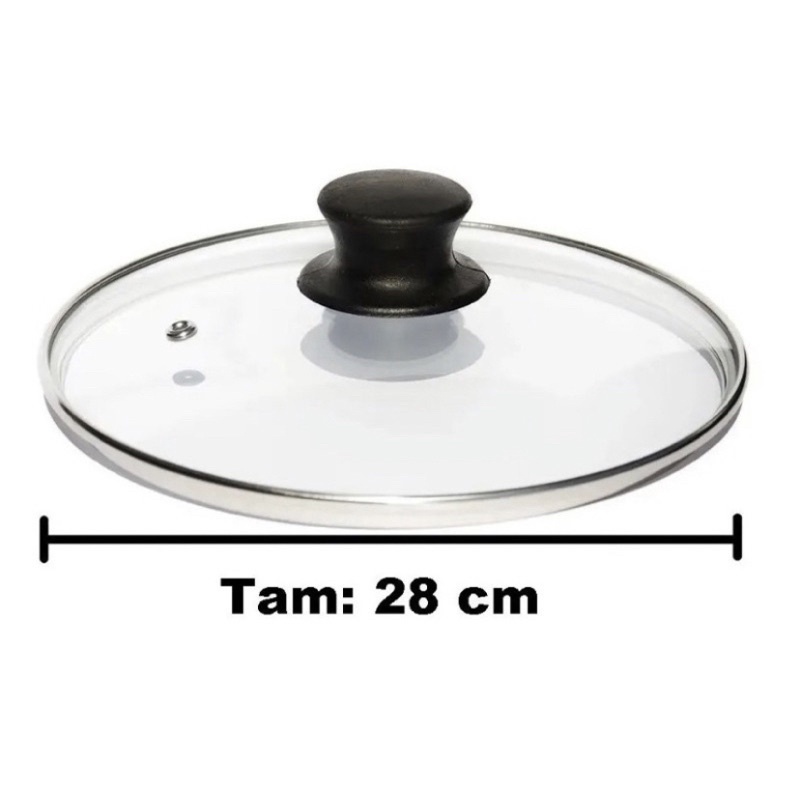 Tampa de vidro temperado grossa com 28 cm de diâmetro; 🚨 Observações: 📌 Acompanha puxador preto de baquellite com parafuso; 📌 Com furo para saída de vapor; 📌 Toque de sofisticação na sua cozinha, veja os alimentos dentro da panela, auxiliando no preparo; ⚠️ Recomendações: 📌 Não é recomendável o uso de máquina de lavar louças; 📌 Espere esfriar antes de lavar, para que não ocorra choque térmico. Especificações técnicas: 📌 Material: Vidro temperado grosso 📌 Diâmetro: 28 cm