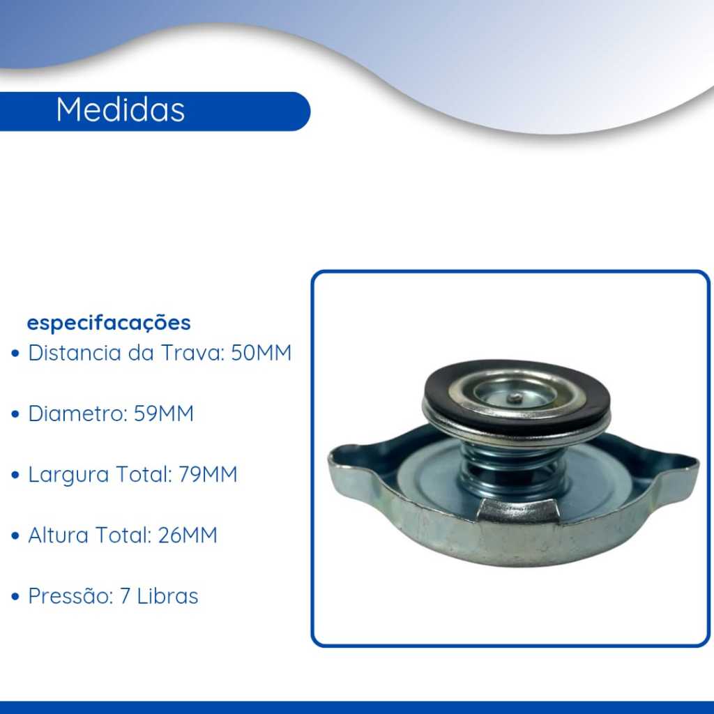 A tampa de radiador é projetada para garantir o controle da pressão interna do sistema de arrefecimento, evitando superaquecimento e garantindo o funcionamento adequado do motor. Especificações Técnicas: Distância da trava: 50 mm Diâmetro: 59 mm Largura total: 79 mm Altura total: 26 mm Pressão de trabalho: 7 libras Modelos com Compatibilidade Caminhonete Chevrolet: A10/C10/D10/A60/C60/D60/A70/C70/D70/A80/C80/D80 Caminhonete Ford: F100/F350/F1000/F4000/F11000/F22000 Trator Valmet: 60/62/65/68/78/85/86/88/685/785 Trator Massey Ferguson:50X/55X/65X/65R/85X/86/95X/235/250/265/270/272/275/283/285/290/292/295/296/297/299/610/620/630/640/650/660/680