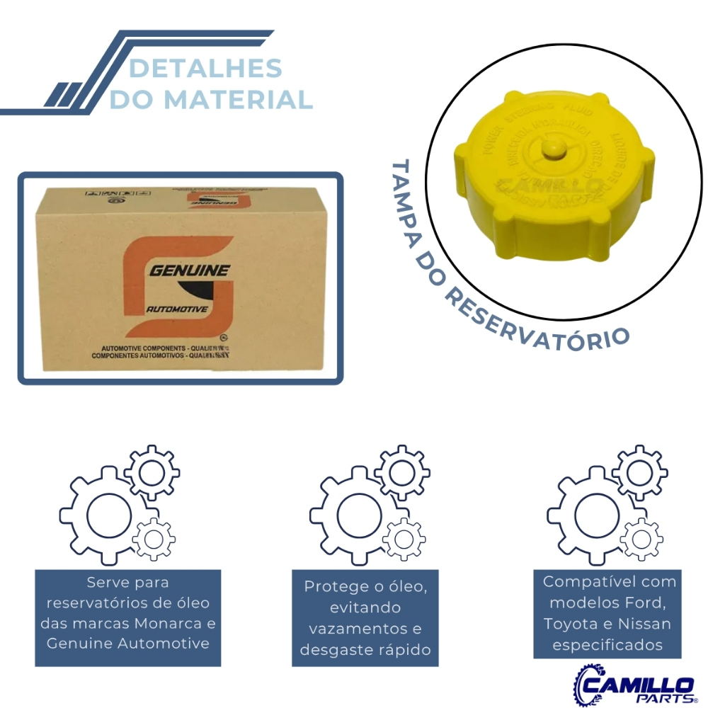 Bem vindo!! Você está em uma loja especializada em soluções automotivas seguras e confiáveis. Aqui, cada detalhe é pensado para cuidar do que move você: sua família, sua segurança e seus melhores momentos na estrada. PRODUTO NOVO Está procurando uma tampa de reservatório de direção hidráulica para Ford, Toyota ou Nissan? Características do Produto: – Tampa para reservatório de óleo da direção hidráulica – Compatível com reservatórios das marcas Monarca e Genuine Automotive – Aplicação em veículos Ford, Toyota Hilux, Nissan Frontier (ver anos abaixo) – Produto novo com excelente vedação – Marca: Genuine Automotive – Código da peça: 28342 // 40049 Por que escolher este produto? – Evita vazamentos e protege o fluido da direção – Mantém o sistema hidráulico sempre selado – Material resistente e de longa vida útil – Ajuste perfeito nos reservatórios indicados Dicas de Uso: – Verifique se o reservatório é da marca Monarca ou Genuine Automotive – Substitua a tampa se houver sinais de desgaste, folga ou trinca – Recomendado instalar com o motor frio Perguntas Frequentes: – A tampa serve em qualquer reservatório? Não. Serve somente nos modelos Monarca ou Genuine Automotive. – Essa tampa é nova? Sim, o produto é novo e pronto para uso. – Em quais veículos ela se aplica? Ford Ka, Courier, Fiesta, Ranger, Ecosport, Escort (consultar anos específicos), Toyota Hilux Pitbull e Hilux nova (diversos modelos e anos), Nissan Frontier (2008 a 2016). Garanta já a sua com envio rápido e procedência garantida!