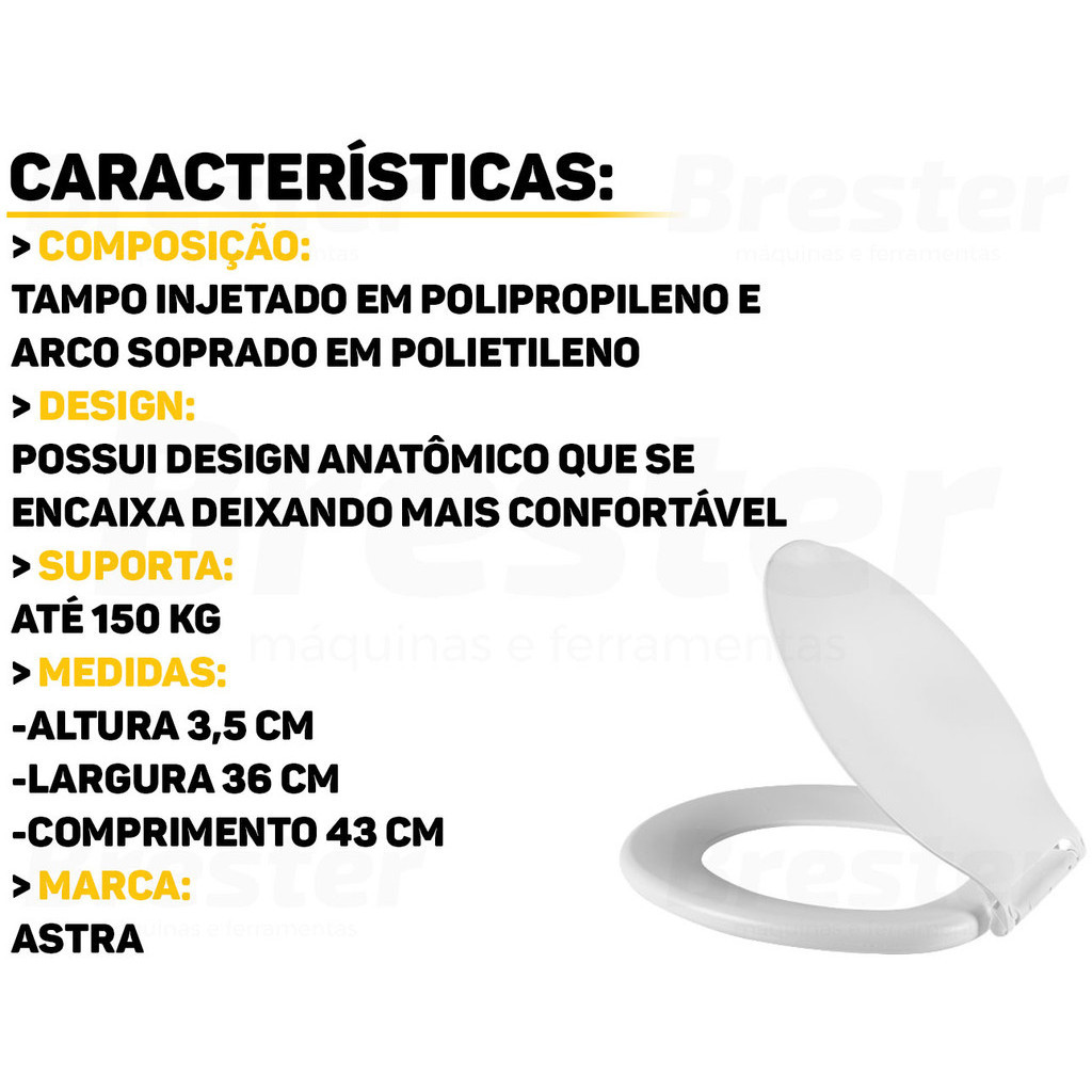 Assento Misto Astra Você já se pegou procurando por um assento sanitário que fosse resistente e que combinasse com a decoração do seu banheiro? O Assento Misto da Astra é a resposta! Seu design anatômico e acabamento impecável tornam o assento funcional. É ideal para quem busca um assento mais simples, porém confortável. Características: > Arco não almofadado; > Confortável e anatômico; > Tampa de cobertura total; > Os modelos suportam até 150 kg; > Tampa injetada em polipropileno e arco soprado em polietileno. Especificações Técnicas: > Material: polipropileno e polietileno; > Dimensões do produto (C x L x A): 44,7cm x 38cm x 4,0cm. - Marca: Astra - Garantia: 90 dias contra defeitos de fabricação Vantagens de comprar na Brester: - Produto a pronta entrega. - Produto novo, com garantia de fábrica. - Nota fiscal para Pessoa Física e Pessoa Jurídica.