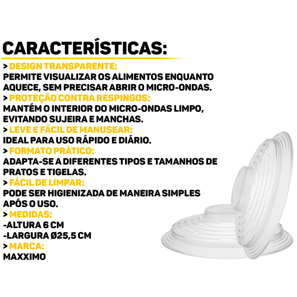 Tampa Plástica para Micro-Ondas Máxximo Mantenha seu micro-ondas limpo com a Tampa Plástica Máxximo. Fabricada em material resistente e livre de BPA, é ideal para cobrir pratos e tigelas, evitando respingos durante o aquecimento. Seu design com aberturas de ventilação permite a saída do vapor, evitando o acúmulo de umidade e garantindo um aquecimento uniforme dos alimentos. Fácil de usar, limpar e armazenar, é um item indispensável para quem busca praticidade no dia a dia. Características: > Fácil de lavar; > Resistente a altas temperaturas; > Produzida com material atóxico, livre de BPA; > Possui design com furos para saída de vapor. Especificações Técnicas: > Material: plástico; > Dimensões do produto (C x L x A): 25cm x 25cm x 7cm. - Marca: Máxximo - Garantia: 90 dias contra defeitos de fabricação Vantagens de comprar na Brester: - Produto a pronta entrega. - Produto novo, com garantia de fábrica. - Nota fiscal para Pessoa Física e Pessoa Jurídica.