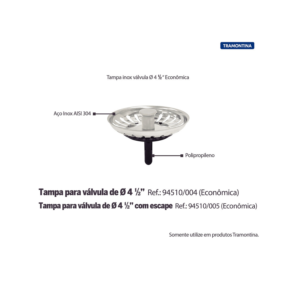 Com a Tampa de Válvula Tramontina Econômica para Pias e Cubas 4 1/2 polegadas de diâmetro em Aço Inox e Polipropileno, você evitará que restos de comida desçam pelo ralo. Uma peça econômica e que proporciona alta durabilidade para a sua cozinha. Informações Técnicas: > Material: Aço Inox Polido + Polipropileno > Modelo: Econômica > Tamanho: 4 1/2'' Recomendações de uso: - Limpar a válvula com detergentes normais neutros. - Usar somente esponja macia ou pano para lavar a válvula. - Evitar o contato com ácido muriático, água sanitária ou qualquer outro solvente que possa vir a agredir o produto. - Marca: Tramontina - Garantia: 3 meses