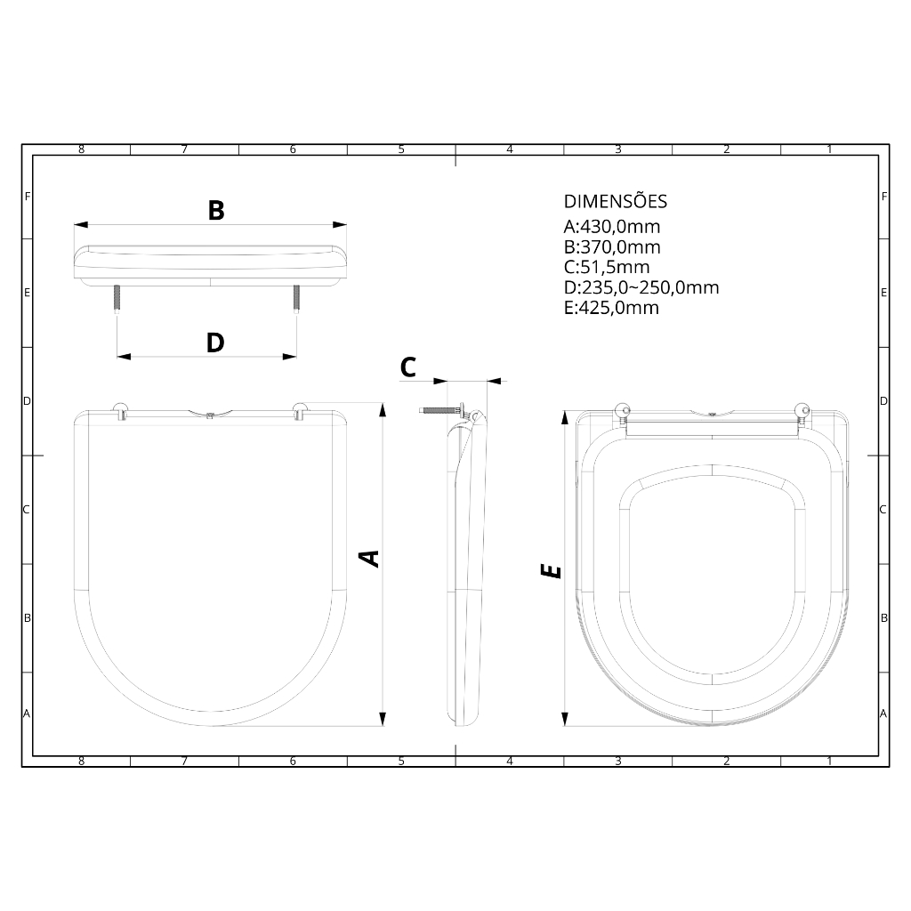 Assento Sanitário Almofadado Calypso Aplicação em vasos sanitários, proporcionando conforto ao usuário. Cor: Cinza Claro Modelo: Almofadado Medidas: 430,0mm x 370,0mm x 51,5mm (Medida especificada nas imagens). Compatibilidade: Vaso Sanitário Linha Calypso Fabricante Incepa. ATENÇÃO: parafusos disponíveis somente na cor branca. Benefícios do Produto: - Espessura maior das existentes no mercado, proporcionando alto conforto e maciez. - Design específico e diferenciado para cada louça. - Alto brilho, combina com todos os ambientes. - Material antifungo, alta proteção contra bactérias. - Tampa envolvente, evita o acúmulo de sujeiras. - Fácil instalação, não necessita de ferramentas. - Fixadores ajustáveis a todas louças sanitárias exclusivas. CUIDADOS NECESSÁRIOS -Não sentar e nem colocar objetos pesados em cima da tampa do Assento -Para limpeza utilizar apenas flanela (ou esponja com o lado macio) e detergente neutro. Não utilizar produtos químicos e nem materiais abrasivos durante a limpeza. -Efetue a limpeza periódica, procurando utilizar produtos neutros. -Todos esses cuidados favorecerão para o aumento da vida útil de seu produto. - 1 ano de garantia contra defeitos de fabricação. - Fabricante: Durín Acessórios e Conexões; - Código do Produto: 00739.