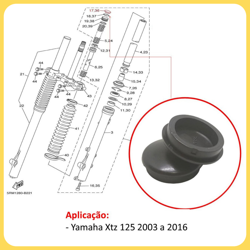 Tampa Superior de Borracha da Bengala Yamaha Xtz 125 Par Aplicação: - Yamaha Xtz 125 2003 a 2016 Conteúdo da Embalagem: - 2 Tampas Superior de Borracha da bengala (Duas Peças) Características: - Material: Borracha - Cor: Preto - Recomendamos levar em um mecânico especializado em manutenção de motos, para fazer a instalação