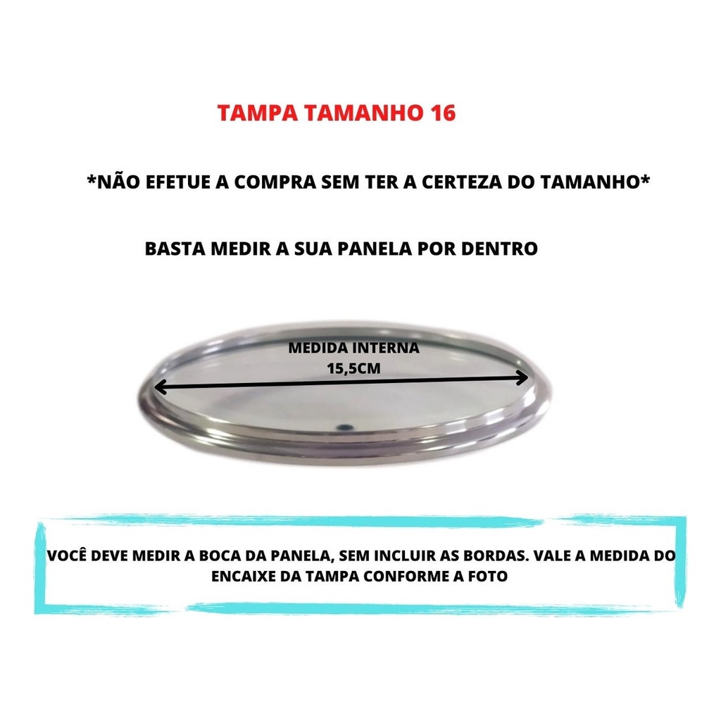 Descrição TAMPAS DE VIDRO TEMPERADO DE ÓTIMA QUALIDADE PARA PANELAS PADRÕES QUE VÃO DA NUMERAÇÃO DO 16 a 24 O anuncio corresponde apenas 1 Tampa. Especificações técnicas Panela numeração 16 Forma da bandeja de dentro ou seja o que encaixa dentro da panela 155cm de largura Panela numeração 18 Forma da bandeja de dentro ou seja o que encaixa dentro da panela 175cm de largura Panela numeração 20 Forma da bandeja de dentro ou seja o que encaixa dentro da panela 195cm de largura Panela numeração 22 Forma da bandeja de dentro ou seja o que encaixa dentro da panela 215cm de largura Panela numeração 24 Forma da bandeja de dentro ou seja o que encaixa dentro da panela 235cm de largura Altura do encaixe das panelas 05 cm Acompanha 1 puxador com parafuso mandamos puxadores pretos de baquelite Enviamos para todo o Brasil Garantia de fabrica E qualquer dúvida estamos à disposição Boas Compas