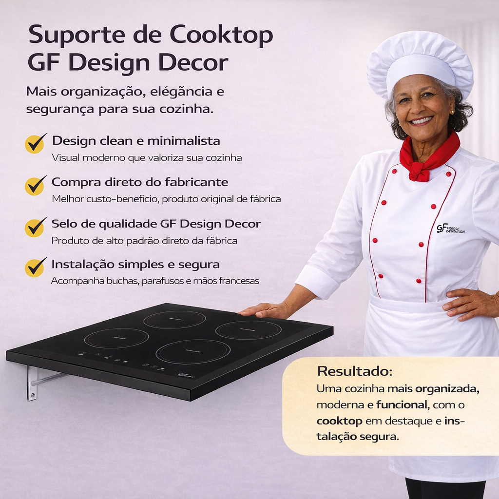 Seja em vindo(a) á GF Arq&Design Móveis e Decorações 🏠🏠 Apresentamos O SOFISTICADO Tampo para FOGÃO DE INDUÇÃO fabricado em MDF de alta qualidade e com superfície lisa e uniforme. Ideal para cozinhas sofisticadas e modernas. Acompanha 2 mão francesa para facilitar a instalação. Pode ser utilizado sem gabinete. ATENÇÃO !!! - COR: PRETO TEXTURIZADO OU BRANCO TEXTURIZADO conforme o anúncio. 📐Especificações: TAMPO PARA FOGÃO DE 4 BOCAS. TAMPO PARA FOGÃO DE 5 BOCAS. TAMPO PARA FOGÃO DE 2 BOCAS. ✅ Material: MDF (Medium Density Fiberboard) ✅ Altura: 18mm ✅ Peso Suportado: até 10 kg ✅ Tempo de Montagem: Em média 15 minutos 📦 Itens Inclusos por unidade (kit): ✅ 1 Tampo para cooktop ✅ 2 Suportes mão francesa ✅ 4 Buchas 8mm ✅ 4 parafusos para parede ✅ 4 parafusos para o tampo - COR: PRETO TEXTURIZADO OU BRANCO TEXTURIZADO. 💡O tampo vai preparado para uso, apenas fixar os suportes na parede fixar o tampo acima dos suportes. Não perca tempo! Adicione um toque de elegância ao seu lar e compre agora mesmo! A montagem é simples e inclui um manual passo a passo para facilitar o processo. O kit de instalação acompanha todas as peças necessárias para que você possa montar seu tampo rapidamente. Transforme a forma como você organiza e exibe seus pertences com este elegante tampo para fogão elétrico de indução que alia design e funcionalidade. ✨ Somos pioneiros com este produto na Shopee! ✨ A GFDESIGN Decor é referência nesse modelo de tampo, sendo uma das primeiras lojas a oferecer esse produto na plataforma. Trabalhamos também com outras cores em anúncios separados, todos com mais de 1.000 vendas realizadas, comprovando a aceitação, qualidade e confiança dos nossos clientes. Agradecemos imensamente a sua confiança em nosso trabalho Comprar conosco é escolher experiência, qualidade, compromisso e segurança ✨ do fabricante direto para sua casa.✨ 💡💡 ATENÇÃO !! CONFIRA AS MEDIDAS DO SEU COOKTOP, VEJA O MANUAL DO SEU FOGÃO E COMPARE O RECORTE DO NICHO PARA ENCAIXE, NÃO FAZEMOS TAMPOS PERSONALIZADOS.