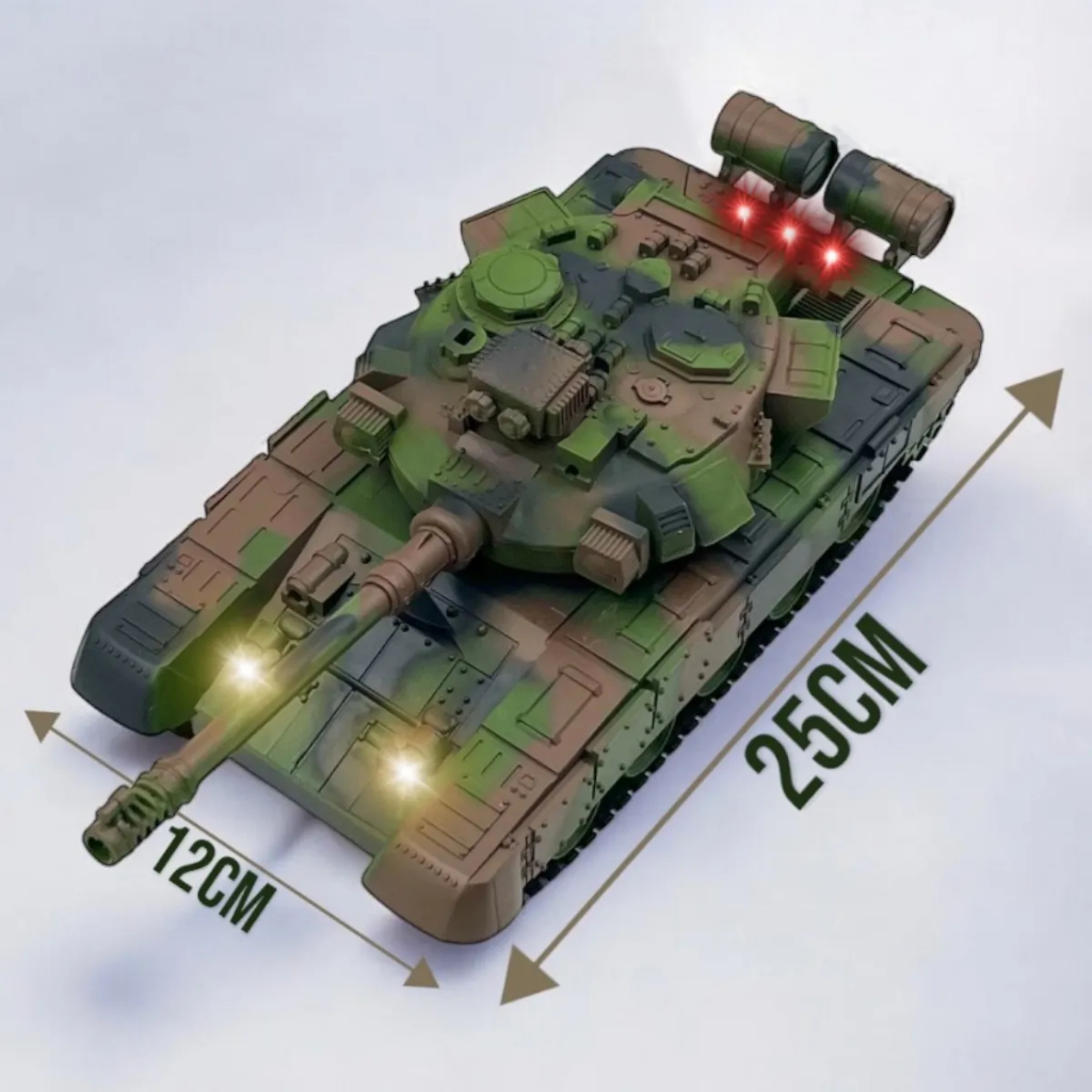 Tanque de Guerra de Controle Remoto desenvolvido para proporcionar uma experiência realista e divertida para crianças a partir de 3 anos. O modelo possui design militar com pintura camuflada, acabamento detalhado e estrutura robusta, garantindo maior durabilidade durante o uso. O tanque conta com sistema de controle remoto R/C de quatro direções, permitindo movimentação para frente, para trás, esquerda e direita, oferecendo total controle durante as manobras. Possui luzes LED funcionais e efeitos sonoros integrados, tornando a brincadeira mais imersiva e estimulante. Equipado com bateria interna recarregável de 3,7V, o tanque pode ser carregado facilmente através de cabo USB, proporcionando praticidade e economia. O controle remoto funciona com duas pilhas AA, que não acompanham o produto. A torre e o canhão fazem parte do design, contribuindo para o visual realista do brinquedo. Fabricado em plástico resistente e não tóxico, é indicado para uso infantil sob supervisão de um adulto. Ideal para brincadeiras em ambientes internos ou externos, estimulando coordenação motora, noção espacial e imaginação. O produto acompanha o tanque de guerra, controle remoto, bateria recarregável e cabo USB para carregamento. Não recomendado para crianças menores de 3 anos por conter partes pequenas que podem ser engolidas. Qualquer dúvida estamos a disposição!