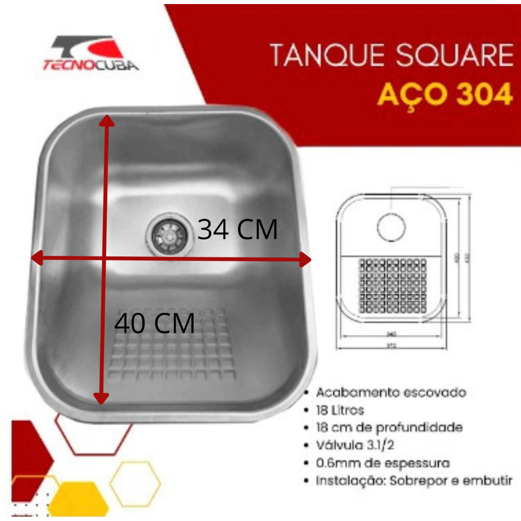 | Tanque de sobrepor Square 34x40 - INOX 304 - Escovado + válvula + ... este produto | R$ 219,90 | — | 5.0/5 | 7 |