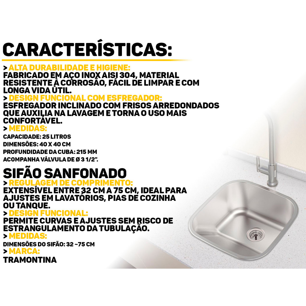 Tanque de Encaixe Compact Inox 40 x 40 cm Tramontina + Sifão Sanfonado Universal Modernize sua lavanderia com funcionalidade e estilo! O Tanque Tramontina Hera Compact 25 litros é a escolha ideal para quem busca um produto compacto, higiênico e durável, sem abrir mão do design. Sifão com ajuste inteligente, ele se adapta a qualquer espaço, oferecendo uma solução eficaz e duradoura. Características do Produto: > Taque com esfregador inclinado com frisos arredondados; > Design moderno com a confiabilidade da Tramontina > Sifão produzido em polipropileno; > Resistente à água quente, até 90º; > Saída escalonada (DN 38, 40, 48 e 50); > Adaptável à qualquer tipo de válvula (7/8'', 11/4'' e 1/ 1/2''). Especificações Técnicas do Tanque: > Capacidade 25 L; > Material Aço Inox AISI 304; > Acabamento escovado; > Profundidade da cuba 215mm; > Dimensões do produto (C x L x A): 40cm x 40 cm x 21,50. Garantia: 12 meses Vantagens de comprar na Brester: - Produto a pronta entrega. - Produto novo, com garantia de fábrica. - Nota fiscal para Pessoa Física e Pessoa Jurídica.