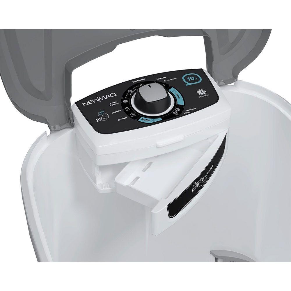 Tanquinho Semiautomático 10kg Newmaq Branco 110VA lavadora Newmaq 10kg e a lavadora certa para acompanhar a rotina das pessoas que nao tem tempo a perder. Caracteristicas: Sistema conta manchas: ideal para evitar manchas indesejadas Big batedor: roupas limpinhas com toda a eficiencia da Newmaq Big dispenser: esse cabe sabao de verdade Big acesso: melhor acesso para retirar e carregar suas roupas sem complicacao Batedor na base Ciclos de lavagem mais rapidos Permitem que voce reaproveite a agua Motor 100 nacional Possui porta moeda Capacidade: 10kg Dimensoes: Altura: 93 cm Largura: 52 cm Profundidade: 56 cm Peso: 9 kg Garantia do Fabricante: 12 meses