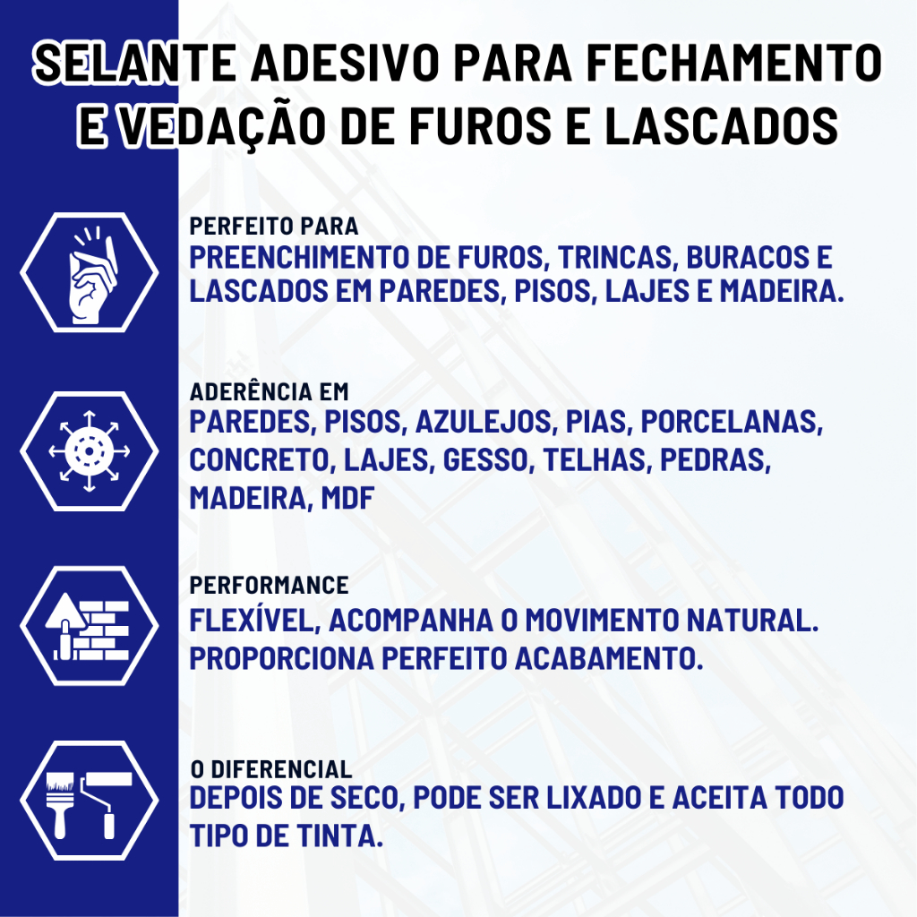 O TAPA FURO VTEX é o segredo dos reparos perfeitos e da praticidade ao alcance de todos! Diga adeus aos furos, buracos e lascados indesejados em paredes, pisos e revestimentos com esta solução adesiva à base d'água que vai transformar a sua vida. Fácil e rápido, qualquer pessoa pode corrigir trincas, furos e rachaduras de até 7mm, sem precisar contratar o serviço de um profissional. É só abrir a bisnaga, aplicar o produto, retirar o excesso e pronto, só aguardar a secagem. Tudo isso sem fazer sujeira! Além de ecologicamente correto por ser à base de água e livre de solventes, não possui odores desagradáveis. E a melhor parte? O TAPA FURO VTEX aceita qualquer tipo de tinta, permitindo que você mantenha a harmonia da decoração sem deixar vestígios dos reparos. ** INSTRUÇÃO DE USO COMPLETO NAS FOTOS ** PRODUTO: VTEX TAPA FUROS - SELANTE PREMIUM PARA FECHAMENTO E VEDAÇÃO DE FUROS E BURACOS TEXTURA DO PRODUTO NA EMBALAGEM: Massa Pastosa TEXTURA DO PRODUTO DEPOIS DE SECO: Rígida e Flexível CORES: Branco | Cinza | Preto | Palha (verificar a disponibilidade de estoque no ato da compra) TEMPERATURA QUENTE: Suporta até 80°C TEMPERATURA FRIA: Suporta até -5°C SECAGEM PARCIAL: 6 horas (podendo aplicar segunda demão) SECAGEM TOTAL: 24 horas (podendo ser lixado e pintado IMPERMEÁVEL, ANTI-FUNGO / ANTI-MOFO RENDIMENTO MÉDIO APROXIMADO EM M² (metros quadrados) NAS FOTOS DO ANÚNCIO - PRODUTO NÃO ADERENTE EM PLASTICO, VIDRO E EVA (TATAME) - RETIRAR O EXCESSO DA COLA LOGO APÓS A APLICAÇÃO. DEPOIS DE SECO A RETIRADA DO EXCESSO SE TORNA EXTREMAMENTE DIFICIL DEVIDO AO ALTO PODER DE FIXAÇÃO! AVISO: O produto na embalagem possui consistência pastosa. Após a cura total o produto fica rígido, porém tem propriedade flexível, ou seja, caso a estrutura sofra alguma movimentação natural, o selante acompanhará tal movimento, não rachando ou trincando com o tempo. INDICADO PARA VEDAÇÃO E FECHAMENTO DE: FUROS–LASCADOS–TRINCAS–RACHADURAS–BURACOS–FRESTAS–FUROS COM BUCHA INTERNA ADERÊNCIA NAS SEGUINTES SUPERFÍCIES: PAREDES–PISOS–LAJES–MADEIRA–GESSO–FORROS–DRYWALL–REVESTIMENTO CERÂMICO–MDF–PORCELANATO–COMPENSADOS–PAREDES–PISOS–LAJES–TIJOLOS–BLOCOS PREPARAÇÃO DA SUPERFÍCIE: Deixar a superfície totalmente SECA, LIMPA e LIVRE de óleo e pó e partículas soltas. COMO UTILIZAR: Realizar a aplicação contra o furo na superfície, afim de realizar o preenchimento total. Utilize e espalhe o selante com uma pazinha, espátula metálica ou de silicone (celuloide). Retirar o excesso logo após a aplicação com a própria espátula ou pazinha. Caso haja retração do produto, aplique uma segunda camada após 6 horas. Após aberto, fechar corretamente para evitar ressecamento do produto dentro da embalagem. Tempo total de cura: 24 horas (podendo ser lixado e pintado). ORIENTAÇÕES ADICIONAIS: 1) Produto PRONTO USO – NUNCA DILUIR com água ou outro componente. A diluição muda toda a estrutura molecular do produto perdendo a sua adesividade. 2) Não aplicar em locais que foram limpos com ácidos ou removedores a base de solventes anteriormente. 3) NÃO MOLHAR, TAPAR COBRIR OU ABAFAR o local após realizar a aplicação até a cura total do produto. 4) Não aplicar em locais molhados, sob umidade ou em dias de chuva. 5) Não seguir tais instruções poderá comprometer o resultado final na aderência do produto. 6) O produto em contato com a pele pode causar ressecamento. Lave com sabão ou sabonete neutro em água corrente. Deixar fora do alcance de crianças e animais. 7) Guardar e armazenar em local seco e arejado. - A PLATAFORMA NÃO PERMITE realizar nenhum tipo de alteração, observação ou atualização do seu cadastro. - A RESPONSABILIDADE DE ENTREGA É 100% DA PLATAFORMA. Não temos interferência em prazos de entrega. A data prevista de entrega aparece em seu painel, dentro do campo de COMPRAS, por isso, se atente a DATA PREVISTA DE ENTREGA que é informada no ato sua compra. - O PRODUTO ACOMPANHA NOTA FISCAL ELETRÔNICA? Sim! Todos os produtos acompanham junto a Nota Fiscal. - DATA DE VALIDADE DOS PRODUTOS: 3 anos de Validade após a data de fabricação. - QUANTO TEMPO LEVA PARA DESPACHAR MINHA COMPRA? Pedidos com pagamentos confirmados até as 11h00 são despachados no mesmo dia. Após as 11h00 o pedido será despachado no próximo dia útil. - POSSUI PRONTA ENTREGA, ESTOQUE? Sim! Todos os nossos produtos possuem pronta entrega em alto volume de estoque. - RECLAMAÇÕES/PROBLEMAS COM A COMPRA: Caso receba o produto com algum problema, pedimos que antes de abrir uma reclamação na plataforma, entre em contato com a nossa equipe através do chat ou telefone disponível nos rótulos de cada produto, para que um de nossos atendentes possa tomar as devidas providências e resolver o problema mais rapidamente. Reclamações abertas dentro da plataforma leva em média 15 dias úteis.