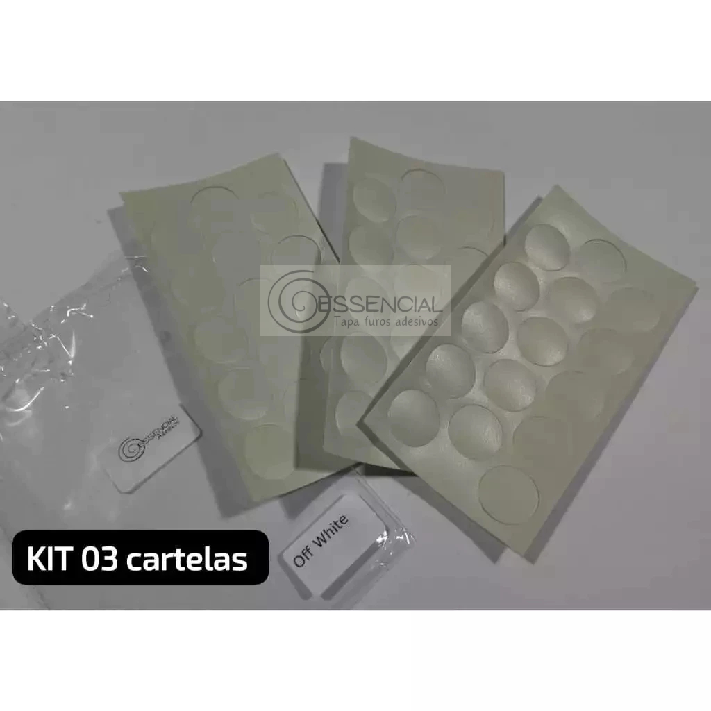 Tapa furos adesivos de alta qualidade para acabamento em móveis e objetos. São KITS com 03, 05 ou 10 CARTELAS DE TAPA FUROS ADESIVOS OFF WHITE PADRÃO DURATEX 19mm. É aquele tapa furos maior (quase 2cm) para cobrir furos e imperfeições maiores. Ideal p/ cobrir minifix. ➡️ Características: Cartela de PVC com adesivo de alta aderência; Cada cartela contém 15 unidades. ➡️Indicação: Indicado para ocultar parafusos, furos e imperfeições, Proporcionando acabamento perfeito a seus móveis e objetos. ➡️ Aplicação: Aplicar o tapa furo em superfície limpa e seca, sem entrar em contato com o adesivo, pressionando por alguns segundos; Aderência total após 24h. ➡️ Conservação: Manter as cartelas em suas embalagens para proteção contra poeira e resíduos; Não submeter a altas temperaturas para manter a qualidade do adesivo. Somos fabricantes de tapa furos adesivos de 12 e 19mm. Nos contate através da plataforma para pedidos diferenciados, sanar qualquer dúvida ou nos dar sua sugestão. Obrigado pela visita e boas compras!!!