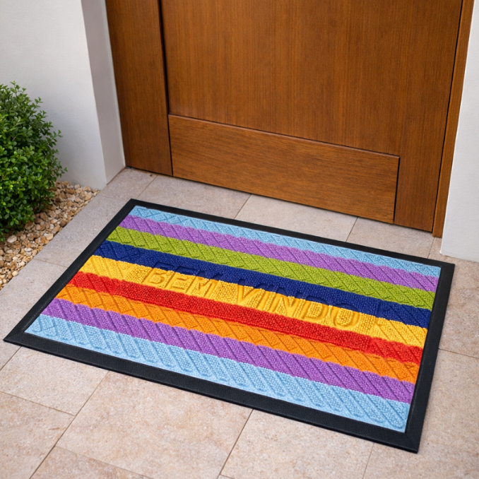 Tapete Emborrachado de Porta Bem Vindo Estampado 40x60 - Várias Estampas. Tapete Decorativo para Porta - 40x60cm. Os tapetes de porta são itens essenciais para você compor a decoração de sua casa. Cuidados com seu Produto: -Lavar a mão. -Não alvejar. -Não usar secadora. -Secar sem torcer. -Não passar. -Não limpar a seco -Secar na Sombra. Base em Látex Antiderrapante O tapete é liso e fabricado com base de látex, um composto emborrachado que permite ao produto segurança e resistência, uma das suas principais características é ser antiderrapante e muito resistente. Além disso, é fácil de higienizar e evita que escorregue devido sua base antiderrapante. Acompanha o produto: • Tapete Decorativo para Porta no tamanho 40cm x 60cm