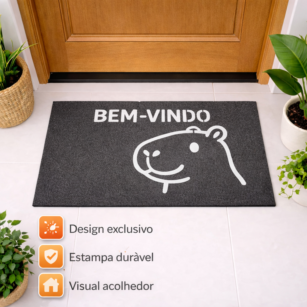 Deixe a entrada da sua casa mais charmosa e acolhedora com o tapete capacho de vinil com estampa exclusiva de capivara. Um modelo criativo, divertido e diferenciado, desenvolvido para quem valoriza decoração com personalidade sem abrir mão da qualidade. Produzido em material vinílico resistente, o tapete retém a sujeira, ajuda a manter o ambiente limpo e possui base antiderrapante, oferecendo mais segurança no uso diário. Além disso, é fácil de limpar, não desfia e tem alta durabilidade, ideal para uso constante. FUNCIONALIDADES E BENEFÍCIOS - Estampa exclusiva de capivara - Material vinílico resistente - Retém a sujeira do calçado - Base antiderrapante - Fácil de limpar e com secagem rápida - Não desfia e não acumula umidade - Ideal para uso diário MEDIDAS - Tamanho: 40 x 60 cm - Formato: Retangular Tamanho ideal para portas residenciais, sem atrapalhar a abertura. INDICAÇÃO DE USO - Porta de entrada - Apartamentos e casas - Áreas cobertas - Escritórios e comércios - Ótima opção para presente criativo LIMPEZA E CUIDADOS - Lavar com água e sabão neutro - Secagem rápida - Não utilizar produtos abrasivos