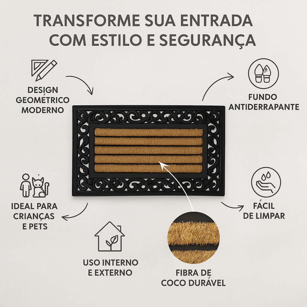 Capacho Imperial em Fibra de Coco e Borracha - Kacyumara Benefícios e Características: Fibras Naturais de Coco: Produzido com fibras resistentes e ecológicas, que proporcionam excelente durabilidade e ajudam a remover a sujeira dos calçados com eficiência. Base Antiderrapante em Borracha: Garante firmeza no piso, evitando escorregões e trazendo mais segurança para a entrada da sua casa. Design Elegante: Moldura em borracha com detalhes vazados que unem praticidade e sofisticação, valorizando a decoração do ambiente. Fácil de Limpar: Para higienizar, basta sacudir o pó ou passar um pano úmido com água. Rápido, prático e funcional. Ficha Técnica: Marca: Modelo: Horizontal Dimensões: 45cm x 75cm Cor: Preto com fibras naturais Composição: 40% Fibra de Coco + 60% Borracha Conteúdo da Embalagem: 01 Unidade Dica de conservação: Evite expor diretamente ao sol por longos períodos. Após lavar, deixe secar sempre à sombra para maior durabilidade.