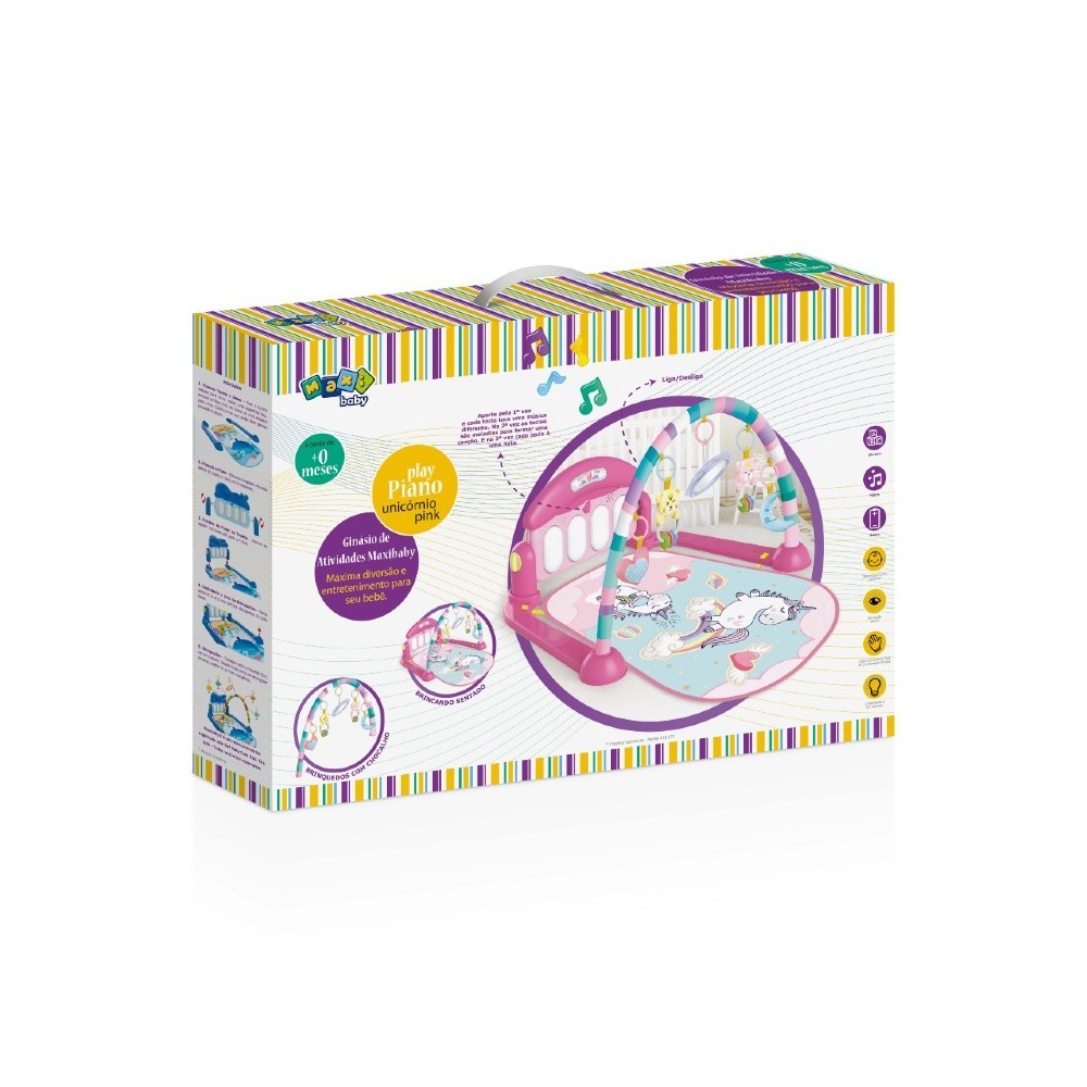 Tapete de Atividades com Play Piano Unicórnio Rosa Maxibaby Um novo tapete colorido que estimula seu bebê à ficar sentado e proporciona maior conforto quando ele estiver de bruços. Os brinquedos coloridos e cheio de texturas estimulam o tato e a coordenação motora. Luzes e sons divertidos aprimoram as habilidades auditivas do seu bebê, além de proporcionar a criatividade e percepção visual com diferentes cores, formas e músicas. Principais Características: - Idade Recomendada: A partir de 2 meses - O piano multifunção acompanha o crescimento do bebês com músicas e interação. - Percepção Visual: Reconhecimento de diferentes formas e cores - Desenvolvimento Tátil: Os brinquedos pendurados e o piano na base promovem o desenvolvimento muscular dos braços e pernas do bebê - Coordenação Motora: Aos 6 meses o bebê já começa a ficar sentado, treinando a capacidade motora e flexibilidade com os brinquedos - Desenvolvimento Auditivo: As teclas do piano tocam diferentes sons e melodias, estimulando a audição dos pequenos. - Funções de Liga / Desliga - Necessário 2 Pilhas AA (Não inclusas) Especificações Técnicas: - Conteúdo da Embalagem: 1 Tapete, 1 Arco, 1 Piano Multifunção, 4 Brinquedos e 1 Espelho - Material / Composição: Estrutura em ABS/Metal - Tecido e Forro em 100% Poliéster. - Garantia: 30 Dias (Contra Defeito de Fabricação Pelo Fabricante) - Dimensões do Produto Aberto (LxCxH): 70,0 x 56,0 x 40,0 cm - Dimensão do Tapete (LxC) 45,0 x 70,0 - Peso: 0,850 kg - Certificação INMETRO: CE-BRI-6378/BRI - Código do Fabricante: 21137 - EAN: 7899403211372 - Marca: Maxi Baby Imagens meramente ilustrativas, as cores e estampas podem variar de acordo com o lote do fabricante. Atenção! Nunca deixe a criança brincar sozinha sem a supervisão de um adulto