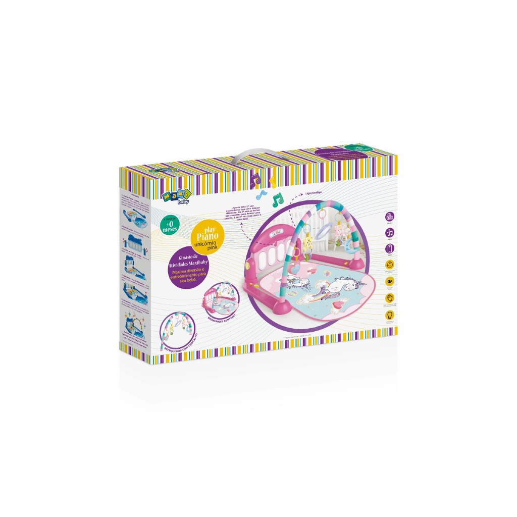Tapete de Atividades com Play Piano Unicórnio Rosa Maxibaby Um novo tapete colorido que estimula seu bebê à ficar sentado e proporciona maior conforto quando ele estiver de bruços. Os brinquedos coloridos e cheio de texturas estimulam o tato e a coordenação motora. Luzes e sons divertidos aprimoram as habilidades auditivas do seu bebê, além de proporcionar a criatividade e percepção visual com diferentes cores, formas e músicas. Principais Características: - Idade Recomendada: A partir de 2 meses - O piano multifunção acompanha o crescimento do bebês com músicas e interação. - Percepção Visual: Reconhecimento de diferentes formas e cores - Desenvolvimento Tátil: Os brinquedos pendurados e o piano na base promovem o desenvolvimento muscular dos braços e pernas do bebê - Coordenação Motora: Aos 6 meses o bebê já começa a ficar sentado, treinando a capacidade motora e flexibilidade com os brinquedos - Desenvolvimento Auditivo: As teclas do piano tocam diferentes sons e melodias, estimulando a audição dos pequenos. - Funções de Liga / Desliga - Necessário 2 Pilhas AA (Não inclusas) Especificações Técnicas: - Conteúdo da Embalagem: 1 Tapete, 1 Arco, 1 Piano Multifunção, 4 Brinquedos e 1 Espelho - Material / Composição: Estrutura em ABS/Metal - Tecido e Forro em 100% Poliéster. - Garantia: 30 Dias (Contra Defeito de Fabricação Pelo Fabricante) - Dimensões do Produto Aberto (LxCxH): 70,0 x 56,0 x 40,0 cm - Dimensão do Tapete (LxC) 45,0 x 70,0 - Peso: 0,850 kg - Certificação INMETRO: CE-BRI-6378/BRI - Código do Fabricante: 21137 - EAN: 7899403211372 - Marca: Maxi Baby Imagens meramente ilustrativas, as cores e estampas podem variar de acordo com o lote do fabricante. Atenção! Nunca deixe a criança brincar sozinha sem a supervisão de um adulto