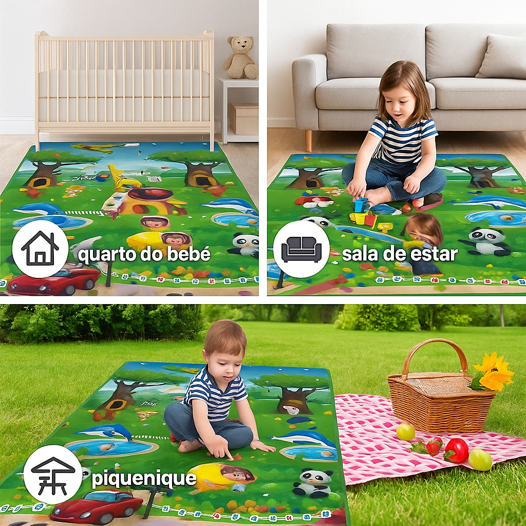 PRODUTO EM ESTOQUE, ENVIO IMEDIATO! 1- O Tapete de Atividades 180x120 térmico Infantil é uma escolha excelente para proporcionar um espaço seguro e divertido para bebês e crianças pequenas explorarem e brincarem. Aqui está uma descrição detalhada: 2- Tamanho: Com dimensões generosas de 180x120 centímetros, este tapete oferece bastante espaço para o bebê se mover e brincar confortavelmente. 3- Material: Fabricado com materiais macios e acolchoados, como espuma de alta densidade e tecido resistente, o tapete oferece uma superfície confortável e segura para bebês engatinharem, rolar e brincarem. 4- Segurança: Com bordas arredondadas e uma base antiderrapante, o tapete proporciona estabilidade e reduz o risco de deslizamento ou acidentes enquanto o bebê está em movimento. 5- Fácil Limpeza: A maioria dos tapetes de atividades infantis são projetados para serem facilmente limpos. Muitos deles são à prova d'água e podem ser limpos com um pano úmido ou até mesmo lavados na máquina, o que facilita a manutenção da higiene do ambiente de brincadeiras do bebê. 6- Benefícios Educacionais: Além de fornecer um espaço seguro para brincar, muitos tapetes de atividades são projetados com elementos educativos, como cores, formas, números e letras, ajudando no desenvolvimento cognitivo e motor da criança enquanto ela se diverte. 7- Portabilidade: Apesar de seu tamanho, muitos tapetes de atividades são leves e fáceis de dobrar, o que os torna convenientes para transportar e armazenar quando não estão em uso. Isso permite que você leve o tapete para diferentes ambientes da casa ou até mesmo para atividades ao ar livre, como piqueniques. 9- Estímulo Sensorial: Com texturas variadas, cores vibrantes e elementos interativos, como brinquedos suspensos e espelhos, os tapetes de atividades ajudam a estimular os sentidos do bebê, promovendo o desenvolvimento sensorial e cognitivo de maneira lúdica e divertida. 10- Versatilidade: Além de ser usado como um espaço de brincadeiras, o tapete de atividades também pode servir como um local confortável para o bebê tirar uma soneca ou para a família se reunir para atividades interativas, como leitura de livros infantis.