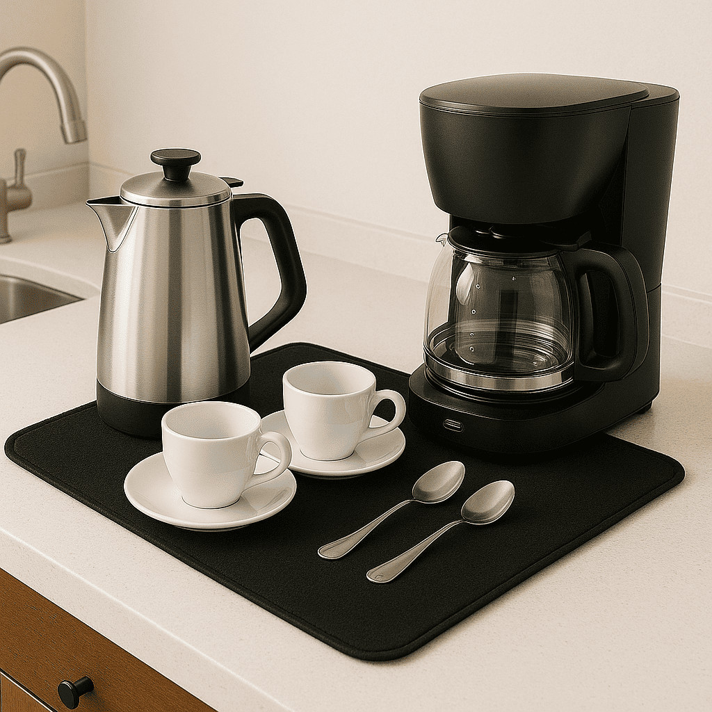 Tapete de Secagem Multiuso — Prático, elegante e super funcional. Ideal para secar louças, copos, talheres e até montar sua estação de café com cafeteira, xícaras e garrafa térmica. Possui material absorvente, antiderrapante e acabamento moderno que valoriza qualquer bancada. Protege sua pia e mantém tudo organizado no dia a dia. - Tamanhos Disponíveis: - 40x30 - 70x35 Especificações: - Alta Performace - Liso - Antiderrapante