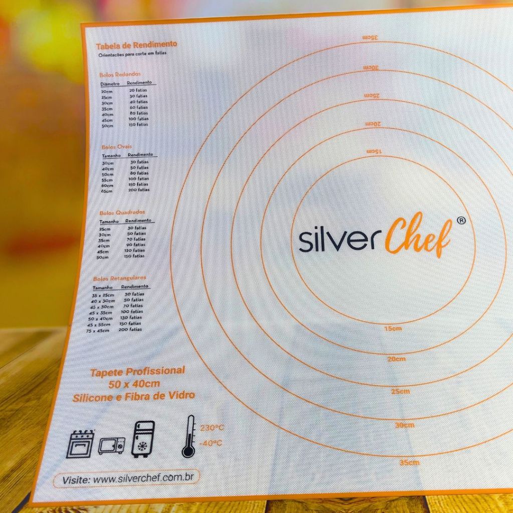 TAPETE PROFISSIONAL DE 50X40 CM CONFECCIONADO EM SILICONE E FIBRA DE VIDRO, DA LINHA SILVER, IDEAL PARA ABRIR MASSAS E MODELAR COM PRECISÃO. RESISTENTE A TEMPERATURAS DE -40°C A 230°C, POSSUI MARCAÇÕES DE MEDIDAS, TABELA DE RENDIMENTO E ORIENTAÇÕES PARA COBRIR BOLOS, PROPORCIONANDO PRATICIDADE E EFICIÊNCIA NA CONFEITARIA.