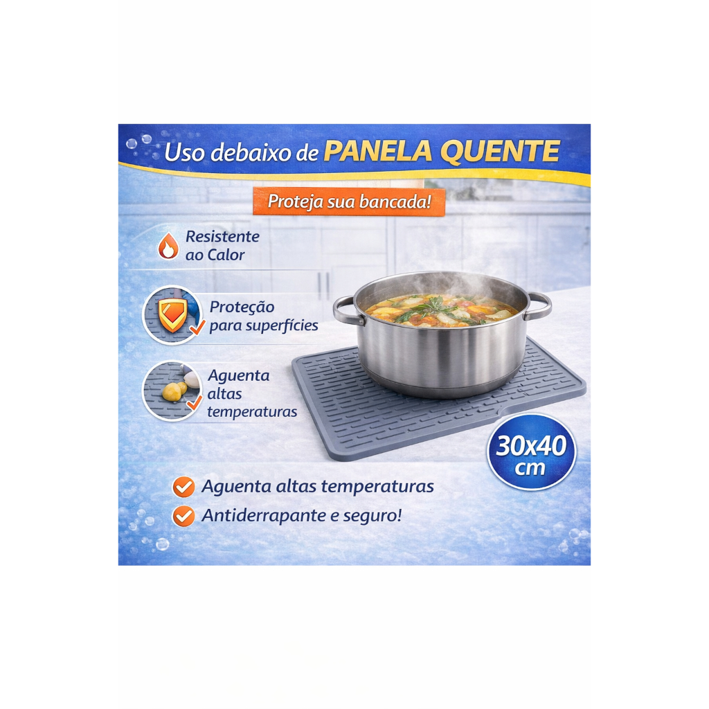 Tapete Escorredor de Louça 2 em 1 de Silicone Antitérmico Antiderrapante 30x40 cm Para Pia e Bancada Deixe sua cozinha mais organizada com o tapete 2 em 1 de silicone, ideal para secar louças e também usar como descanso para panelas e frigideiras quentes. Ele ajuda a manter a bancada protegida e a pia mais seca no dia a dia. Principais benefícios ✅ 2 em 1: escorredor de louça + descanso de panela ✅ Silicone antiderrapante: mais firmeza para copos, pratos e talheres ✅ Antitérmico: protege a bancada ao apoiar utensílios quentes ✅ Drenagem eficiente: ajuda a escorrer a água com mais praticidade ✅ Flexível e fácil de limpar: lave rapidamente e guarde sem ocupar espaço Especificações Material: Silicone Medidas: 30 x 40 cm Uso: pia, bancada, apoio de utensílios e panelas Conteúdo da embalagem: 1 tapete de silicone 2 em 1.