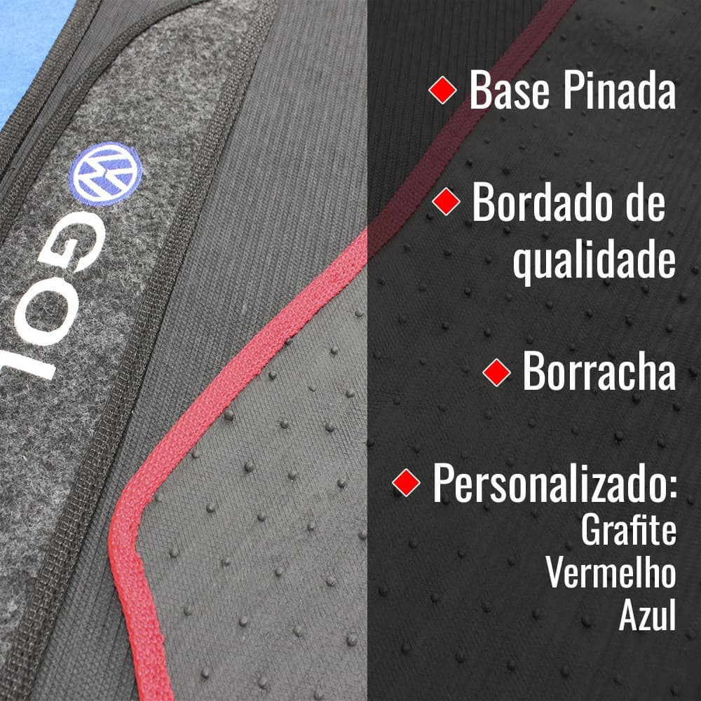 Atenção tapetes de borracha exclusivos JG DE TAPETE AUTOMOTIVO BORRACHA 3 PEÇAS PVC GOL 1981 A 2023 VERMELHO GRAFITE OU AZUL Proteja o assoalho automotivo com o Tapete de Borracha que garante conforto para o motorista e conta com base antiderrapante para mais segurança, evitando que o tapete se desloque enquanto você dirige. Compatível com: - GOL QUADRADO G1 1981 1995 - GOL BOLA G2 1996, 1999 - GOL G2 SPECIAL 20002002 - GOL G3 2000/2005 - GOL G4 2006/2014 - GOL G5 2009/2012 - GOL G6 2013/ 2016 - GOL G7 2016/ 2019 - GOL G8 2020/ 2023 CARACTERÍS - Cor: Borracha e Detalhes da borda em Azul/Vermelho/Grafite - Material: PVC com base antiderrapante pinado/ Detalhes em carpete colorido - Bordado em carpete (Motorista e Passageiro) ITENS INCLUSOS: - 02 Tapetes dianteiros - 01 Tapete traseiro ---> Procure em nossa loja por "TAPETE" e encontre mais modelos.