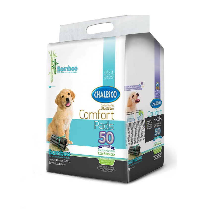 TAPETE CONFORT BAMBOO CHALESCO PRODUTO ORIGINAL E A PRONTA ENTREGA O Tapete Higiênico Ecológico BAMBOO da Chalesco é feito com carvão ativado de Bambu que neutraliza melhor o odor e disfarça as manchas amarelas da urina. É ultrafino com maior absorção e contém sistema de abas contra vazamento, além do Gel Super Absorvente. Pode ser fixado ao chão, pois contém adesivo colante. * Ecologicamente correto CARACTERÍSTICAS DO PRODUTO: Indicado para: Cachorros Porte: Pequeno ou Médio Tipo de Material: Fibras de Bamboo Contém 50 unidades em cada pacote DIMENSÕES DO PRODUTO: Largura: 60 cm Comprimento: 80 cm CHALESCO Representante exclusiva de grandes marcas mundiais, a Chalesco investe constantemente em pesquisas e no desenvolvimento de produtos, junto a fabricantes nacionais e internacionais, para oferecer a seus clientes uma linha variada, com alta tecnologia, qualidade, design e excelente relação custo-benefício.