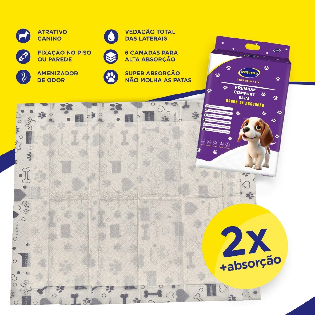 MELHOR E MAIOR CUSTO BENEFICIO !!!! MÁXIMA ABSORÇÃO E CONTROLE DE ODOR – 2X MAIS EFICIÊNCIA! Tapete Higiênico HIGIENEPET Premium Comfort Ultra Absorção – 30 Unidades (60cm x 90cm) *Absorção Instantânea com 6 Camadas Super Absorventes *Controle de Odor Avançado *Ideal para todas as raças e ambientes *Com 4 adesivos que não deixam resíduos no piso *Produto com Nota Fiscal *Descrição do Produto: Marca: HIGIENEPET Modelo: Premium Comfort Ultra Absorção Conteúdo da Embalagem: 30 unidades Tamanho total do tapete: 60cm x 90cm Área de absorção: 50cm x 70cm Camadas: 6 camadas com tecnologia antiodor Fixação: 4 adesivos que não deixam cola no chão Composição: Celulose, Polietileno, Polipropileno, Papel, Polímeros, superabsorventes, Fita adesiva Produto atóxico e seguro para seu pet Indicado para: Cães de porte pequeno e médio Ambientes internos: apartamentos, casas, áreas internas e ou cobertas. Uso em viagens ou locais sem acesso imediato à rua. *Dicas de Uso: Para fêmeas e filhotes, fixe o tapete no chão com os adesivos. Para machos adultos, fixe parcialmente na parede e no chão. Posicione sempre longe da comida, caminha ou casinha do seu pet. Garanta o melhor para o seu cão com o Tapete HIGIENEPET Premium! Conforto, higiene e praticidade no dia a dia.