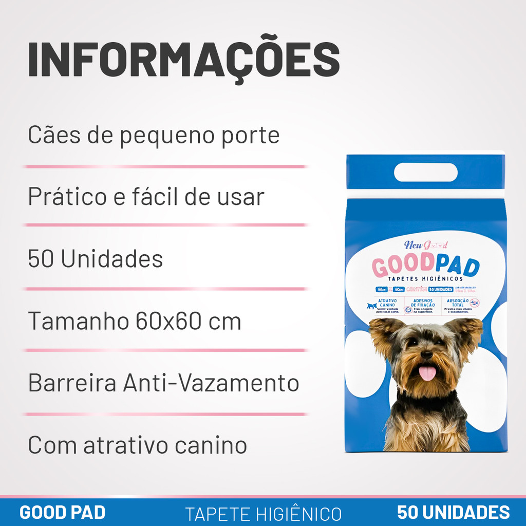 ____________________________________________________________________________ A nossa loja está a mais de 10 anos no mercado, com produtos originais e com nota fiscal. ____________________________________________________________________________ O Tapete Higiênico Good Pad 60x60 é a escolha perfeita para manter a higiene do seu pet com praticidade e eficiência. Ideal para cães de pequeno porte, ele possui dimensões de 60x60 cm, oferecendo amplo espaço para o conforto do seu animal de estimação. kit Com 50 unidades por pacote, é uma solução econômica e duradoura para o dia a dia. Fabricado com materiais de alta qualidade, o Tapete Higiênico Good Pad apresenta uma camada superior macia e suave, evitando irritações na pele do animal, enquanto a camada interna altamente absorvente transforma rapidamente os líquidos em gel, evitando vazamentos e odores desagradáveis. A base impermeável impede que o líquido penetre no chão, protegendo pisos e carpetes. Perfeito para treinamentos, viagens e para o uso diário, o Tapete Higiênico Good Pad 60x60 garante um ambiente sempre limpo e seco, proporcionando mais conforto para o seu pet e praticidade para você. Compacto e fácil de armazenar, ele é uma escolha confiável e eficiente para manter sua casa sem sujeira e odores. ___________________________________________________________________________ ESPECIFICAÇÃO: Tamanho: 60x60cm; Indicado para: Cães de pequeno e médio porte; Capacidade: Um pouco mais de 500ml. ____________________________________________________________________________ Gostou? Não perca tempo, garanta já o seu!
