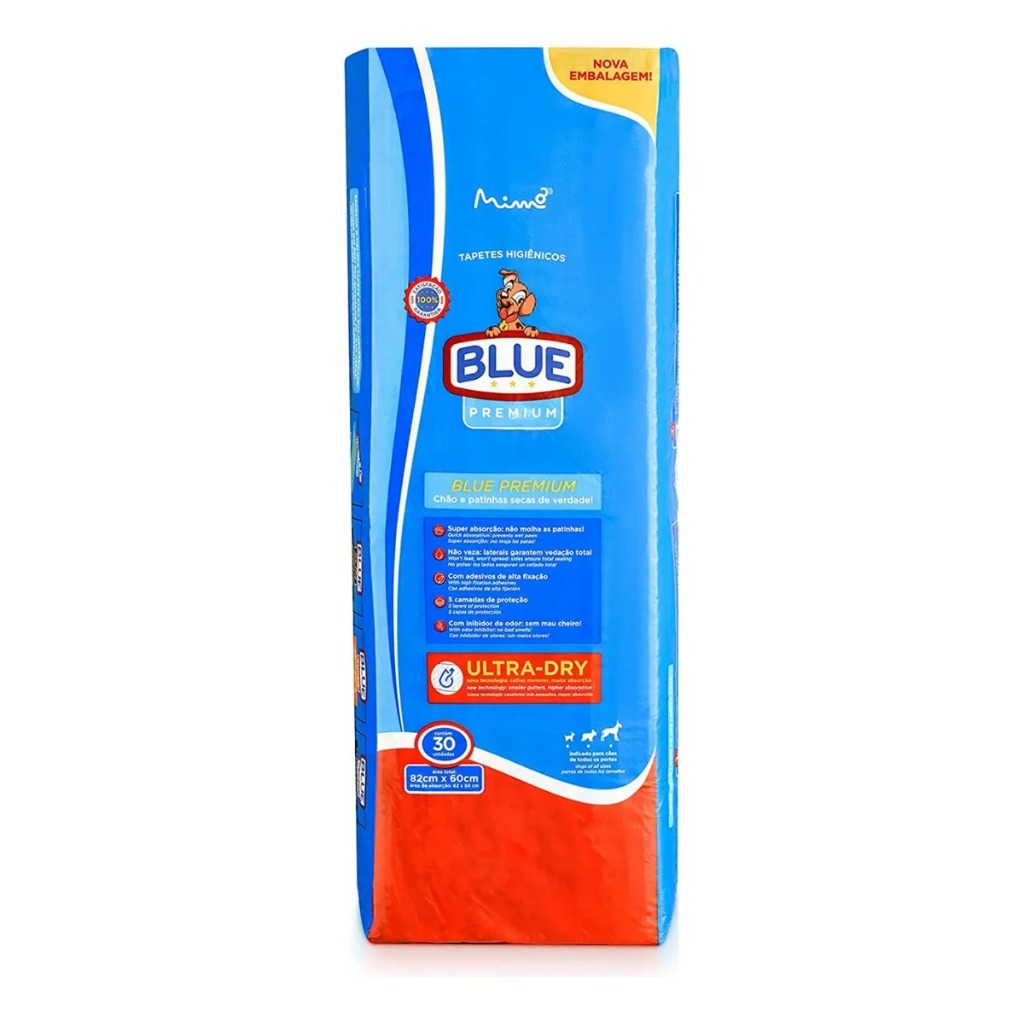 Tapete Higiênico Para Cães 82x60cm 30 und Blue Premium Os tapetes higiênicos Blue Premium ajudam a manter a sua casa limpa e aconchegante por mais tempo, sem vazamentos ou odores desagradáveis. Nem sempre a rotina permite levar os cãezinhos para dar uma volta, mas com o Blue Premium a sua casa pode continuar limpinha e cheirosa e seus bichinhos tranquilos fazendo suas necessidades em local apropriado e higiênico. O gel de secagem ultrarrápida evita que patinhas molhadas sujem a casa e seu design eficiente conta com maior área de absorção e barreiras anti vazamento que impedem acidentes desnecessários no piso da sua casa. Os adesivos anti bagunça colam com resistência para não voar e descolam fácil para não marcar o piso. Os Blue premium evitam o mau cheiro e a proliferação de bactérias na sua casa. Com 30 unidades de 82x60 cm de área, os tapetes são ideais para todos os portes de cachorros! Além de tudo isso, cada tapete conta com atrativo canino natural, que ajuda no adestramento do seu pet. ATENÇÃO: Não é indicado fixar as fitas adesivas em superfícies com cera, desmoldante, poeira, úmida, molhada ou de alta rugosidade (pisos externos) e paredes. O Blue original: aquele que você já conhece bem! Super absorção: Não molha as patinhas Com adesivos de alta fixação 5 camadas de proteção Com inibidor de odor: sem mau cheiro Ficha Técnica Marca: Blue Modelo: 1 Cor: Branco Tamanho área ativa: 82X60CM Animal Recomendado: Para Cachorross Porte: Pequeno, Médio, Grande