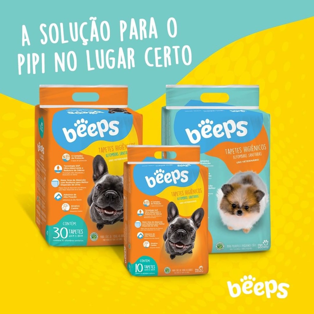 Tapete Higiênico Beeps - Training Pads - 60x80cm - 30 Un. O Tapete Higiênico Training Pads - foi desenvolvido especialmente para cães de todas idades. - 5 camadas de proteção, garante maior retenção de líquidos; - Maior área de absorção com ranhuras para melhor dispersão da urina; - Tecnologia SAP: superfície ultra absorvente e redutora de odores; - Tapete com design exclusivo; - Com atrativo canino: tapete com cheirinho de mel; - Adesivos de alta fixação, não sai do lugar; - Ultrafino, ocupa menos espaço e é fácil de transportar. Compactos e muito eficientes! - Ecológico: menos uso de celulose e embalagem menor, reduzindo a emissão de CO2 e ajuda na preservação do meio ambiente Contém 30 unidades de 60x80cm. Marca: Beeps.