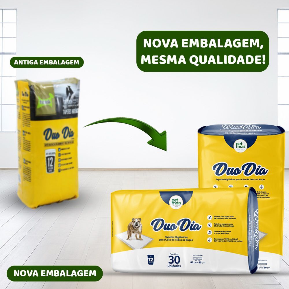 Tapete Higiênico Duo Dia Petmais – Máxima Absorção e Controle de Odor O Tapete Higiênico Duo Dia Petmais foi desenvolvido para garantir máxima proteção e conforto para o seu pet. Conta com tecnologia de dupla camada e gel superabsorvente, ideal para ambientes internos. Perfeito para manter o local limpo e livre de odores desagradáveis. Benefícios: - Dupla camada com gel superabsorvente. - Controle eficaz de odores. - Barreira antivazamento. - Fitas adesivas para fixação. - Ideal para cães de todos os portes. Composição: Celulose, polímero superabsorvente, TNT, filme impermeável, adesivos e fragrância suave. Modo de usar: Posicione o tapete no local desejado, com o lado plástico voltado para baixo e o lado absorvente voltado para cima. Fixe com as fitas adesivas, se necessário. Troque o tapete sempre que estiver saturado. Recomendações: Armazene em local seco, fresco e protegido do sol. Mantenha fora do alcance de crianças e outros animais. Uso exclusivo para pets.