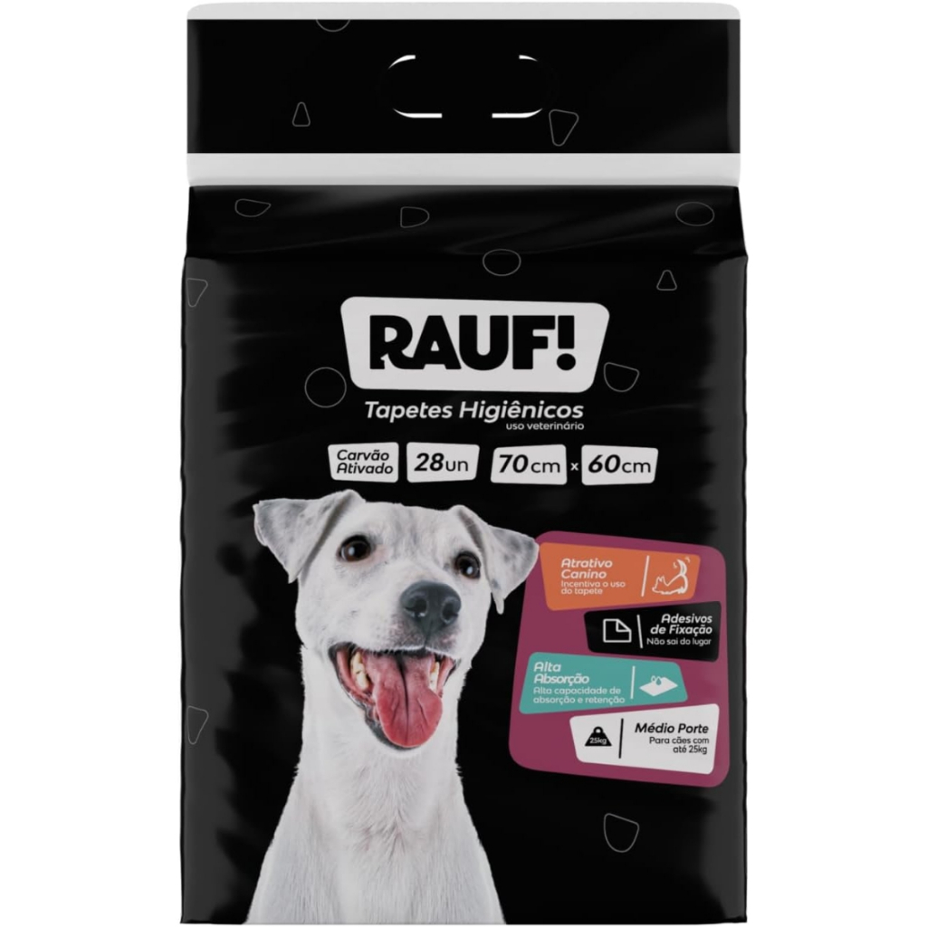 O RAUF - TAPETE HIGIENICO PARA CÃES - RAUF CARVAO ATIVADO 70cmx60cm 28und - Econômico, é prático e fácil de usar, além de ser compacto e caber em qualquer lugar. Por ser produzido com material superabsorvente e possuir design específico para distribuir melhor o xixi, neutraliza os odores e é ideal para o treinamento e manutenção da higiene dos cães. Por conter barreiras de proteção nas bordas o xixi não vaza, além disso possui atrativo canino que facilita muito o treinamento do seu amiguinho. Tapete da linha econômica e que tem o melhor custo benefício do mercado. É indicado para filhotes e adultos de pequeno porte e para internações.