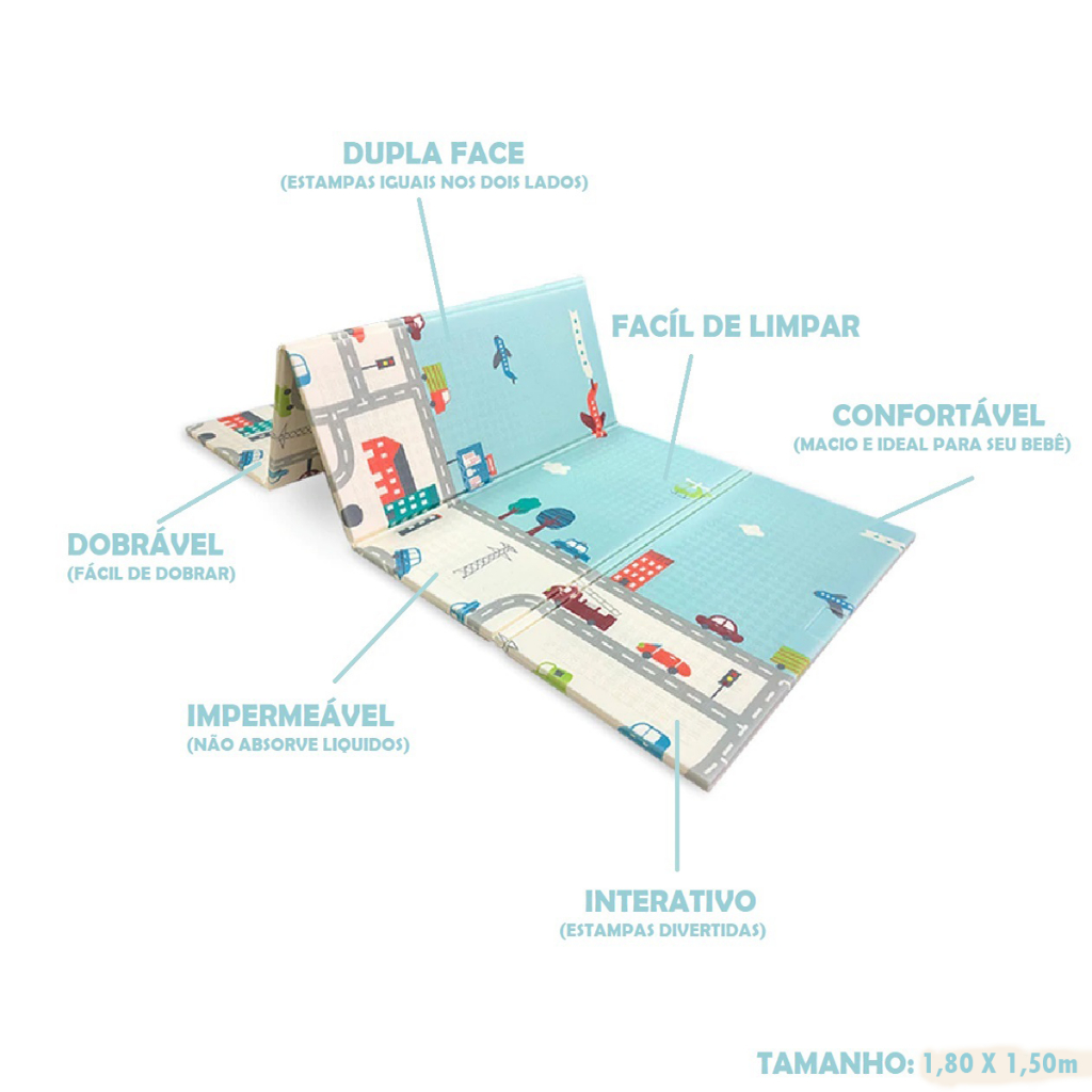 TAPETE INFANTIL DUPLA FACE UNISSEX - 6mm de espessura - ESTAMPAS: PISTA DUPLA FACE (mesma estampa em ambos os lados). - ACOMPANHA SACOLA PARA TRANSPORTE! - TAMANHO 1,80 x 1,50 metros - estofado permitindo conforto e segurança ao seu filho. - Pode ser levado para atividades ao ar livre em parques. - Possui 2 lados estampados com desenhos recreativos - Pode utilizado no quarto das crianças, na sala, em escolas, berçários, salas de recreação e parques. - Fácil transportar e guardar, o tapete é leve e dobrável. Estampa colorida e divertida que estimula as crianças a brincarem. Facilita o desenvolvimento dos bebês aprender engatinhar além de proteger do frio e do calor do chão. O tapete reduz os barulhos das atividades e dos brinquedos jogados pela criança no chão , Caracteristicas Gerais - Material : Polietileno : Espuma de alta densidade, durabilidade e maciez - Emborrachado - Impermeável : Não absorve liquido/ Fácil de limpar - Anti-derrapante - Antitérmico / Isolante térmico : Protege do Frio /Calor - Dupla Face : Estampas dos dois lados - Inodoro: Não tem cheiro - Acompanha sacola para transporte : enviado dobrado na sacola CUIDADOS COM O PRODUTO: LIMPEZA FÁCIL - Necessita apenas um pano úmido – evitar produtos químicos abrasivos - Não usar em pisos sem acabamento , pois irá danificar o produto - Não desembalar/manipular com objetos perfuro cortantes(tesouras,estiletes,facas ) entre outros Perguntas/ Dúvidas/ Reclamações e Sugestões Antes de Fazer a compra tire todas as suas dúvidas no campo Pergunte ao vendedor localizado abaixo do anúncio pois será atendido rápido e com satisfação Especificações: - Tapete macio e resistente à água (impermeável). - Confeccionado em espuma atóxico, proporcionando um tapete confortavelmente acolchoado. - Possui revestimento especial em alto relevo na superfície, antiderrapante. - Fino acabamento das bordas para evitar tropeços. - Sua superfície possui tratamento antibacteriano. - Proporciona um excelente isolamento térmico: ótimo para pisos frios. - Pode ser usado a partir do nascimento do Bebê. - Fácil de guardar: o tapete é super leve, dobrável e acompanha sacola ecológica com alça para transporte. - Material Antialérgico. - Não acumula poeira nem ácaros. - Não absorve líquidos. - Fácil limpeza: Limpe com um pano macio e úmido. Medidas Aproximadas: - Altura: 1,80 M - Largura: 1,50 M - Espessura: 6 MM Contém: - 1 Tapete Infantil Dobrável Térmico Dupla Face; - 1 Bolsa ecológica para Transporte TAG: Tapete infantil, Tapete Térmico Infantil, Tapete emborrachado Infantil , Dupla Face , Gigante, Sacola, Tapete Atividades Infantil, Envio Imediato