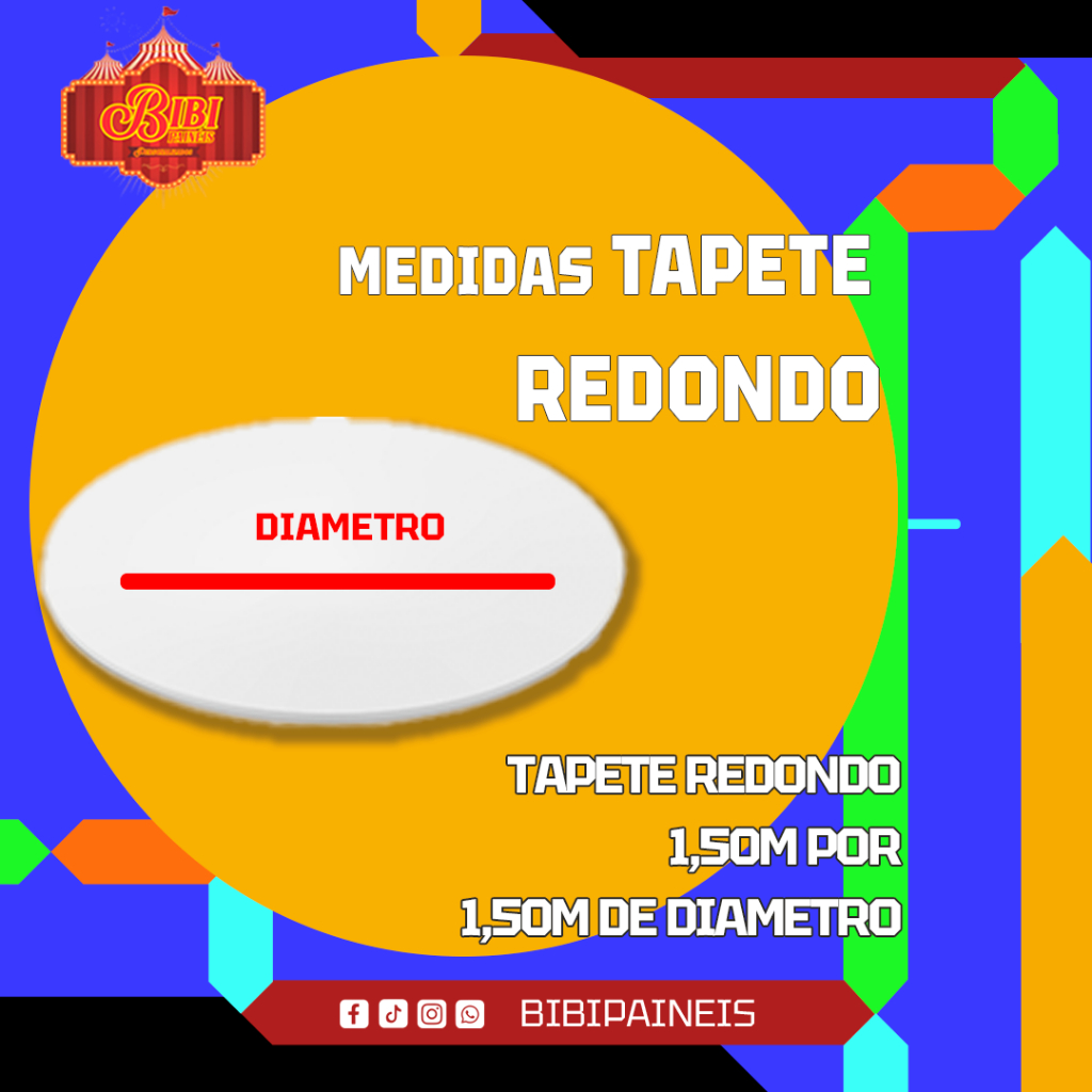 Tapete Redondo Decorativo 1,5m Transforme sua festa em um ambiente ainda mais sofisticado com nosso tapete redondo decorativo! Ideal para compor cenários de painéis, mesas de bolo e espaços instagramáveis, ele traz charme e elegância para qualquer evento. Medida: 1,5m x 1,5m Material: Tecido Malha Flexível Poliéster com Elastano – resistente, durável e com excelente acabamento. Indicado para: Festas infantis, casamentos, aniversários, chá revelação, eventos corporativos e muito mais. Inovação no Design: Sempre acompanhando as últimas tendências. DETALHES IMPORTANTES: - Temas como: Glitter, Madeira, Ripado, dentre outros, são apenas imitações que remetem a sensação do mesmo. - Alta durabilidade. - Imagens em alta resolução (sem borrões ou serrilhados). - Cores vivas e vibrantes. - Pode ser lavado inúmeras vezes. - Não retém líquido, se molhar vai secar rapidamente. - Pode ser passado (recomendamos baixas temperaturas). - Não possui emendas. - Pode ser molhado ou lavado com água e sabão neutro, evite ser exposto ao sol pois secam rapidamente. Design Personalizado: Escolha entre uma ampla variedade de designs. Fácil de montar e combinar com diferentes estilos de decoração Acabamento de qualidade que valoriza o ambiente e destaca suas fotos Dê um toque especial à sua decoração com esse item indispensável para encantar seus convidados! PRODUÇÃO E ENVIO: Enviamos seu pedido em até 48 horas após a compra. Todos os nossos produtos possuem garantia. DEVOLUÇÃO E TROCA Envie uma mensagem para gente caso tenha algum problema com seu pedido, nossos atendentes estão a todo momento em pronto atendimento para solucionar o mais rápido possível. OBSERVAÇÕES IMPORTANTES Atente-se aos prazos de produção e entrega informados no anúncio. Sinta-se à vontade para nos enviar uma mensagem caso tenha alguma dúvida. Estaremos prontos para te responder. BIBI PAINÉIS AGRADECE E BOAS COMPRAS!