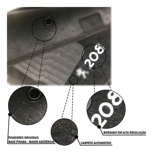 JG TAPETES PEUGEOT 208, CARPETE Compatibilidade: todos modelos 2021, 2022, 2023 Especificações: . Bordados em alta definição, diretamente no carpete, seguindo o padrão da montadora. . Parte superior em CARPETE AUTOMOTIVO. . BASE DE BORRACHA PINADA, aumentando a aderência e maior durabilidade. . Totalmente IMPERMEÁVEL. . Fácil lavagem. . Sob medida para seu carro. . Fixação motorista: ilhós (botão) para fixação no PINO ORIGINAL + VELCROS. Composição: 02 Peças Dianteiras Bordadas 02 Peças Traseiras 01 Tapete para o túnel Garantia: 03 meses contra defeitos de fabricação. A POTENZAPARTS garante a qualidade do produto.