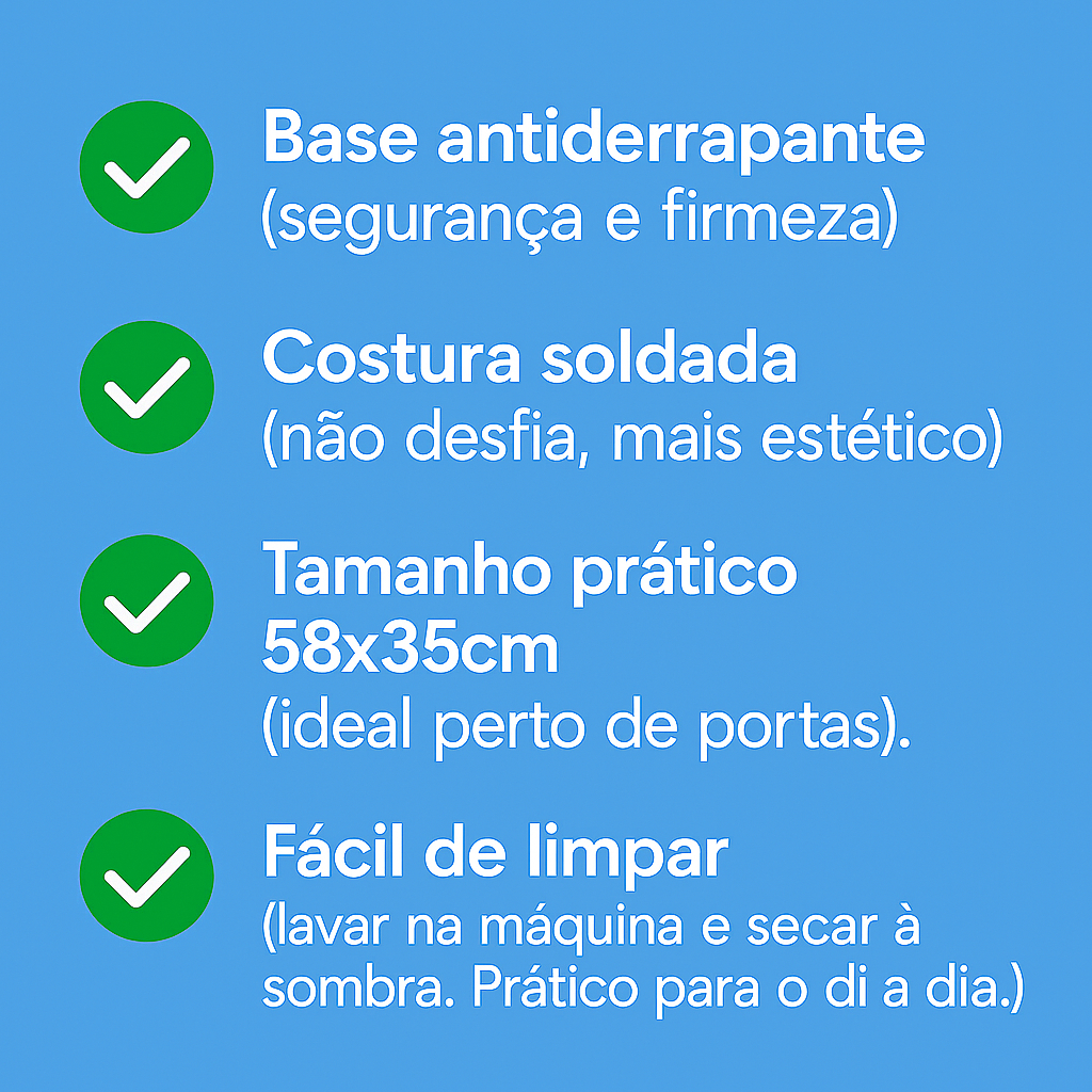 ✨ Vantagens do produto: ✅ Base antiderrapante para mais segurança. ✅ Borda Soldada nas laterais para maior durabilidade. ✅ Fácil de limpar: lavar na máquina e secar à sombra. Prático para o dia a dia. ✅ Tamanho ideal (35x58cm), perfeito para portas de entrada. ✅ Divertido, combinando com o estilo do seu espaço. ✔️ Ideal para casas, apartamentos, escritórios e até como presente criativo. 🏡 Mantenha sua casa limpa e acolhedora com praticidade e estilo! 💙