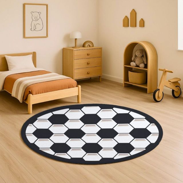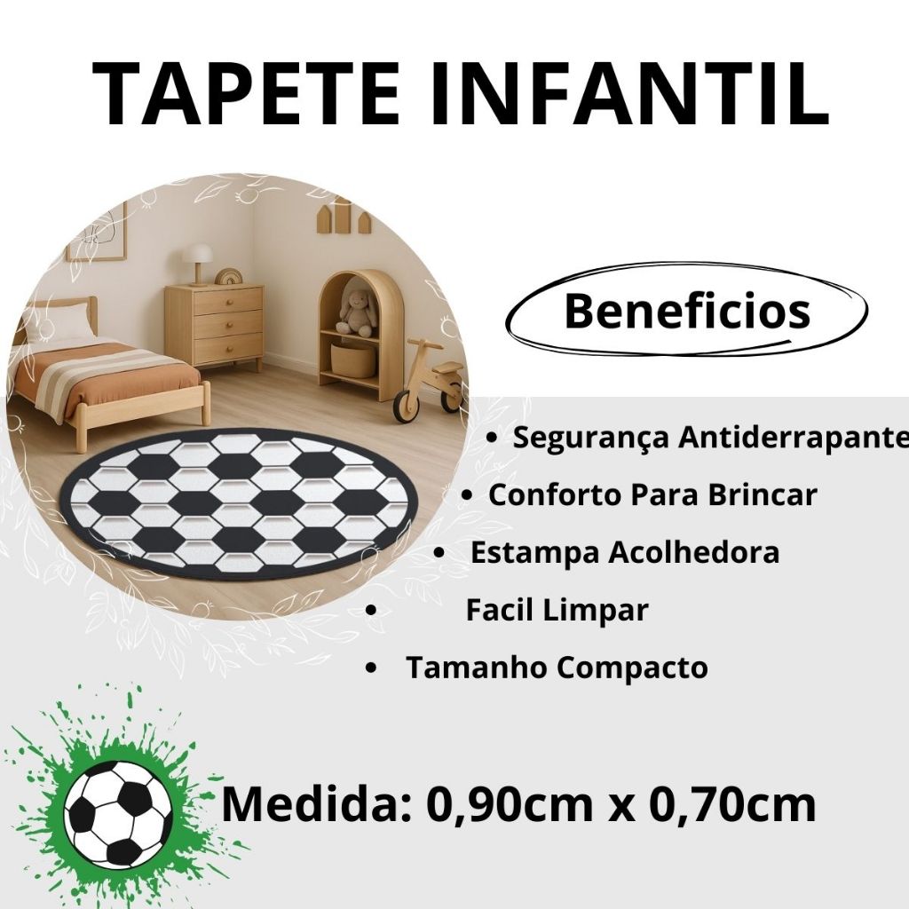 Tapete Tatame Antiderrapante Emborrachado Quarto Infantil Criança Menino Bola Futebol Preto Redondo
