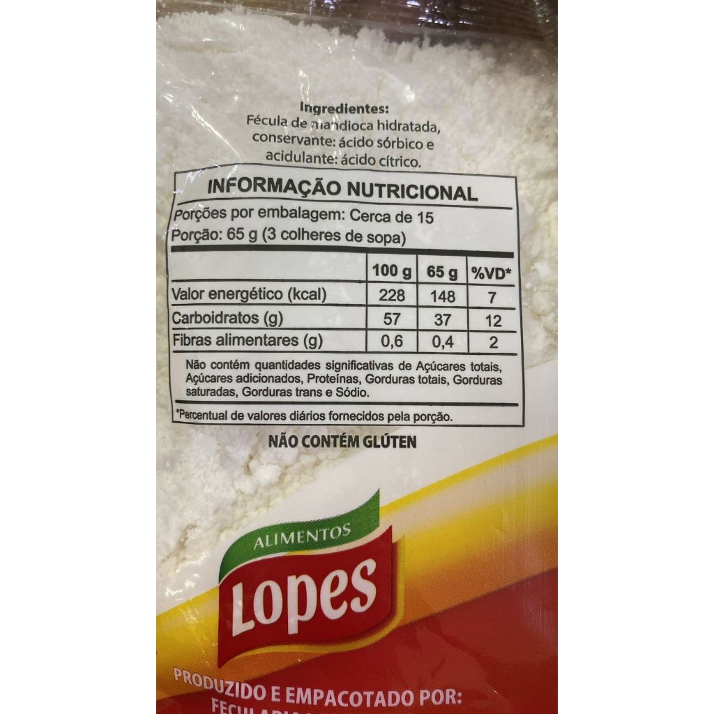 Tapioca semipronta da Alimentos Lopes é um produto natural e sem conservantes, feita com a goma fresca hidratada da mandioca pronta para o preparo. Rende em média 10 tapiocas (1Kg). Sugestão de Preparo: Aqueça a frigideira e espalhe a tapioca ( já peneirada) por aproximadamente dois minutos, até que a Tapioca solte-se da borda, coloque em seguida o recheio desejado. Dobre-a sobre o recheio. Aguarde 30 segundos e pronto. Ingredientes: Fécula de mandioca, ácido cítrico e ácido sórbico. Não contém glúten. Modo de Conservação: Conservar em local fresco e arejado. Depois de aberto, conservar em local refrigerado de 1 a 10ºC. Consumir em 5 dias.