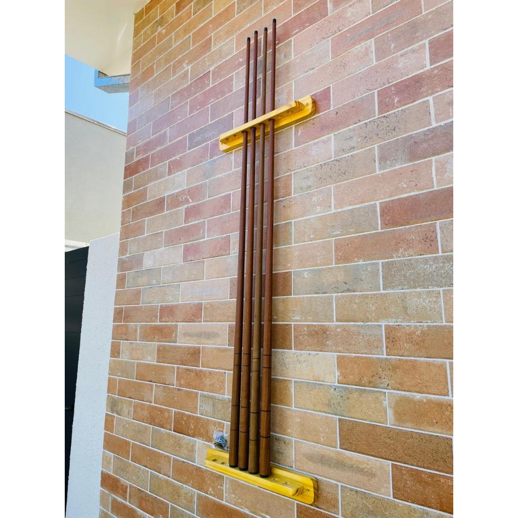 Suporte para tacos bi partido envernizado Projetada para quem busca organização com um toque rústico, esta taqueira é a solução perfeita para armazenar seus tacos de bilhar. Fabricada em madeira de pinus de alta qualidade com acabamento em verniz, oferece durabilidade e um visual natural que se integra facilmente a qualquer ambiente. Destaques que fazem a diferença: Capacidade Ideal: Com espaço para até 8 tacos, você terá todos os seus equipamentos de jogo sempre à mão e bem organizados. Design Bi-Partido Inteligente: A estrutura dividida em duas partes facilita o transporte e a instalação, além de oferecer um visual moderno e diferenciado. Madeira de Pinus Sustentável: A escolha do pinus garante um produto resistente e com um acabamento envernizado. Fixação Segura e Simples: Acompanha parafusos e buchas, garantindo uma instalação firme e segura na parede, evitando quedas e danos aos seus tacos. Proteção e Conservação: Ao armazenar seus tacos na taqueira, você os protege contra empenamentos, arranhões e outros danos, prolongando sua vida útil. Otimização de Espaço: Libere espaço na sua sala de jogos, mantendo os tacos organizados e fora do caminho. Estilo Versátil: O design clean e a beleza natural do pinus se adaptam a diversos estilos de decoração, desde o mais rústico ao contemporâneo. Invista na organização e na beleza do seu espaço de jogos. Adquira agora mesmo a sua Taqueira Bi-Partida em Pinus para 8 Tacos e desfrute de um ambiente mais elegante e funcional! Ideal para: Salas de jogos residenciais Clubes e associações Bares e restaurantes com mesas de bilhar Áreas de lazer em geral Não perca tempo! Garanta já a sua taqueira e eleve a experiência dos seus jogos de bilhar!