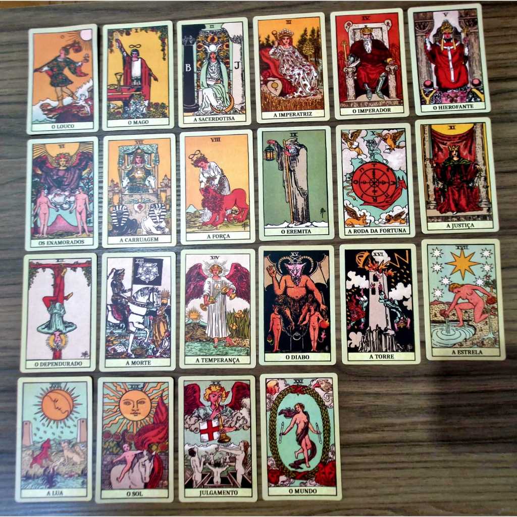Baralho Tarot Smith-Waite 22 CARTAS (SOMENTE ARCANOS MAIORES), cartas no formato tarô 7x11cm, impresso colorido em papel cartão especial para cartas e revestido em plástico fosco dos 2 lados das cartas. ACOMPANHA MANUAL EM PROTUGUÊS.