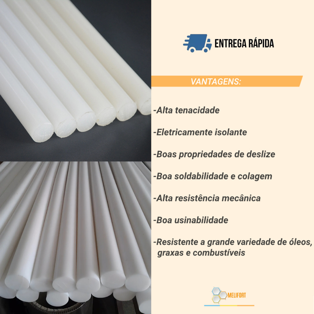 TARUGO DE NYLON PA6 POLIAMIDA NATURAL Ø 16 X 1000 MM O Tarugo de Nylon 6 Poliamida é reconhecido por sua alta tenacidade e resistência mecânica, um baixo coeficiente de atrito e baixo desgaste por abrasão, ideal para aplicações industriais exigentes. Possui resistência a óleos, graxas e combustíveis, e suas propriedades elétricas isolantes, resistente em uma ampla faixa de temperaturas, entre 160°C em curto prazo e 100°C em longo prazo. DESCRIÇÃO TÉCNICA * 16mm de Diâmetro; * 1000mm de Comprimento; * Tolerância máxima: +0,9 mm / Tolerância mínima: +0,1 mm; * Material: Nylon 6 (PA 6 - Poliamida 6). APLICAÇÕES: * Buchas * Engrenagens * Roletes * Roscas transportadoras * Sapatas e outros. PRODUTOS À PRONTA ENTREGA.